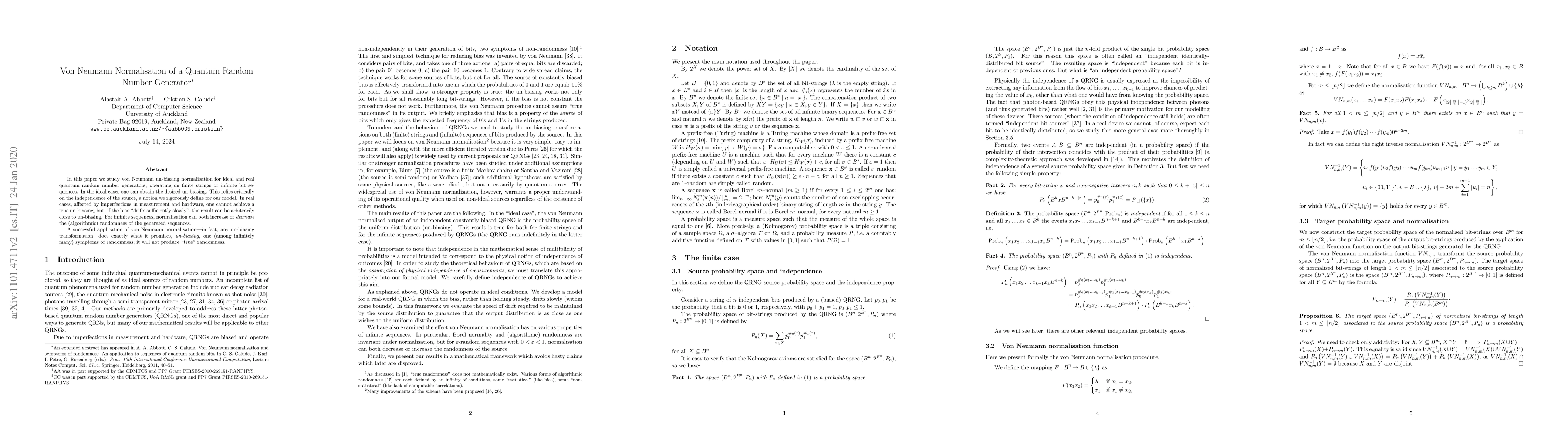 In this paper we study von Neumann un-biasing normalisation for ideal and real quantum random number generators, operating on finite strings or infinite bit sequences. In the ideal cases one can obtain the desired un-biasing. This relies critically on the independence of the source, a notion we rigorously define for our model. In real cases, affected by imperfections in measurement and hardware, one cannot achieve a true un-biasing, but, if the bias "drifts sufficiently slowly", the result can be arbitrarily close to un-biasing. For infinite sequences, normalisation can both increase or decrease the (algorithmic) randomness of the generated sequences. A successful application of von Neumann normalisation---in fact, any un-biasing transformation---does exactly what it promises, un-biasing, one (among infinitely many) symptoms of randomness; it will not produce "true" randomness.