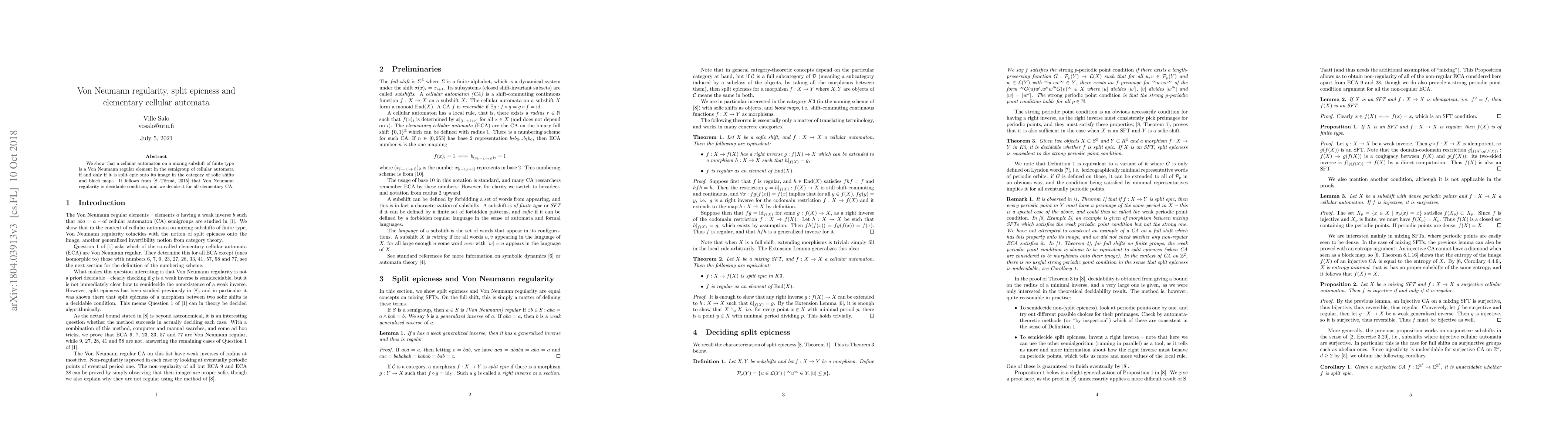 A study linking Von Neumann regularity in cellular automata to split epic properties on sofic shifts and block maps has been conducted, with implications for decidability and elementary CA analysis.