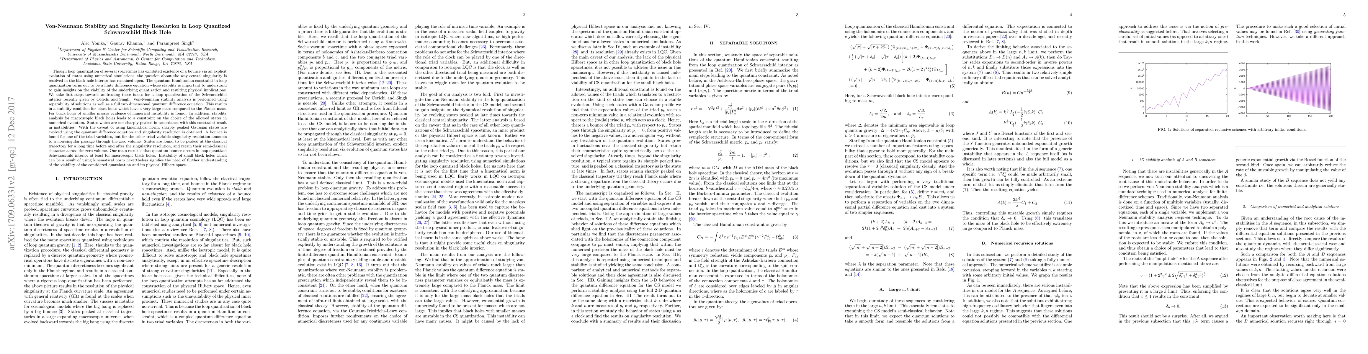 Though loop quantization of several spacetimes has exhibited existence of a bounce via an explicit evolution of states using numerical simulations, the question about the way central singularity is resolved in the black hole interior has remained open. The quantum Hamiltonian constraint in loop quantization turns out to be a finite difference equation whose stability is important to understand to gain insights on the viability of the underlying quantization and resulting physical implications. We take first steps towards addressing these issues for a loop quantization of the Schwarzschild interior recently given by Corichi and Singh. Von-Neumann stability analysis is performed using separability of solutions as well as a full two dimensional quantum difference equation. This results in a stability condition for black holes which have a very large mass compared to the Planck mass. For black holes of smaller masses evidence of numerical instability is found. In addition, stability analysis for macroscopic black holes leads to a constraint on the choice of the allowed states in numerical evolution. With the caveat of using kinematical norm, sharply peaked Gaussian states are evolved using the quantum difference equation and singularity resolution is obtained. A bounce is found for one of the triad variables, but for the other triad variable singularity resolution amounts to a non-singular passage through the zero volume. States are found to be peaked at the classical trajectory for a long time before and after the singularity resolution, and retain their semi-classical character across the zero volume. Our main result is that quantum bounce occurs in loop quantized Schwarzschild interior at least for macroscopic black holes.