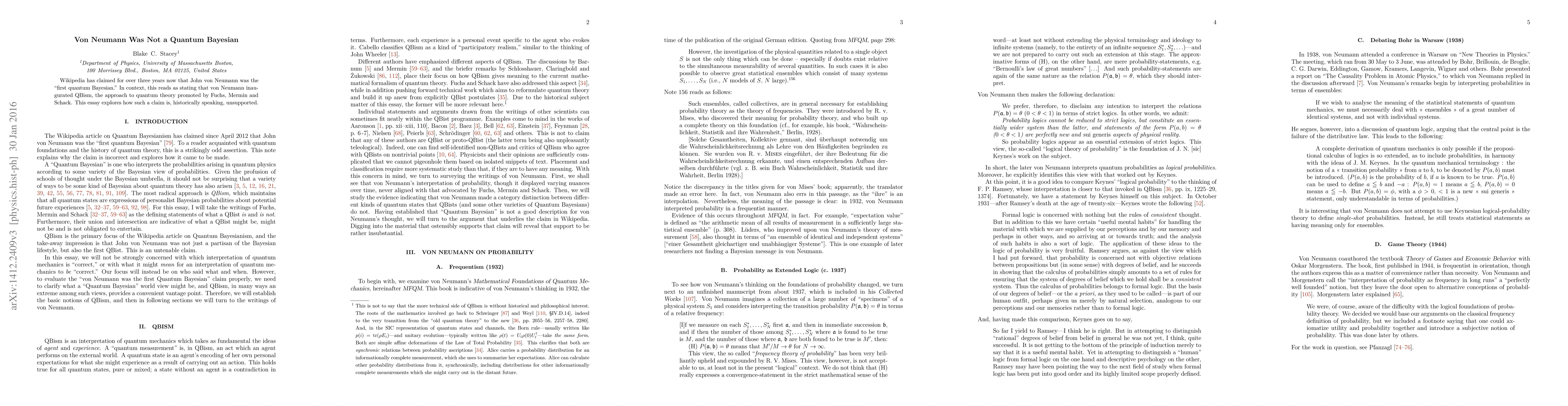 Title: Von Neumann Was Not a Quantum Bayesian Summary: This paper argues that the assertion that John von Neumann was the "first quantum Bayesian" is historically unfounded, challenging the claim that he initiated QBism, a modern interpretation of quantum theory.