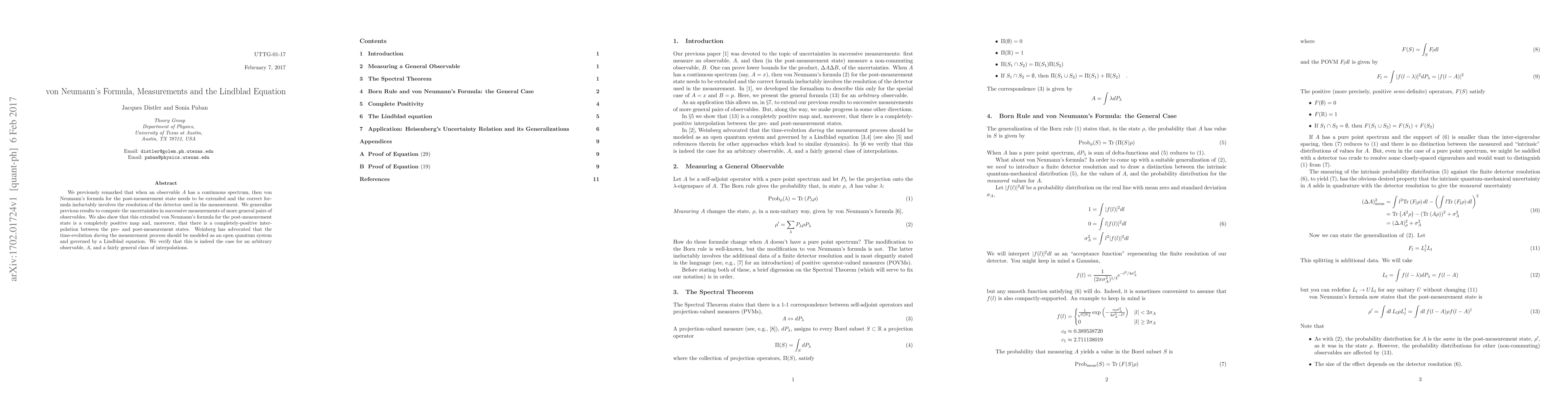 We previously remarked that when an observable A has a continuous spectrum, then von Neumann's formula for the post-measurement state needs to be extended and the correct formula ineluctably involves the resolution of the detector used in the measurement. We generalize previous results to compute the uncertainties in successive measurements of more general pairs of observables. We also show that this extended von Neumann's formula for the post-measurement state is a completely positive map and, moreover, that there is a completely-positive interpolation between the pre- and post-measurement states. Weinberg has advocated that the time-evolution during the measurement process should be modeled as an open quantum system and governed by a Lindblad equation. We verify that this is indeed the case for an arbitrary observable, A, and a fairly general class of interpolations.