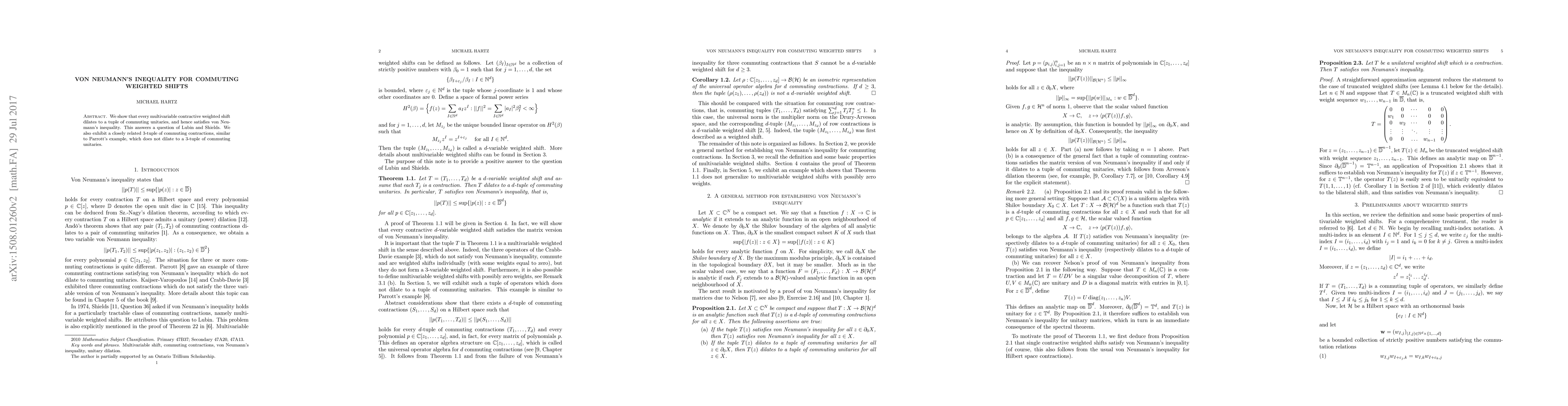 This paper proves that every multivariable contractive weighted shift dilates to a tuple of commuting unitaries, satisfying von Neumann's inequality, thus answering Lubin and Shields' question. It also presents a specific 3-tuple of commuting contractions that does not dilate to a 3-tuple of commuting unitaries, akin to Parrott's example.