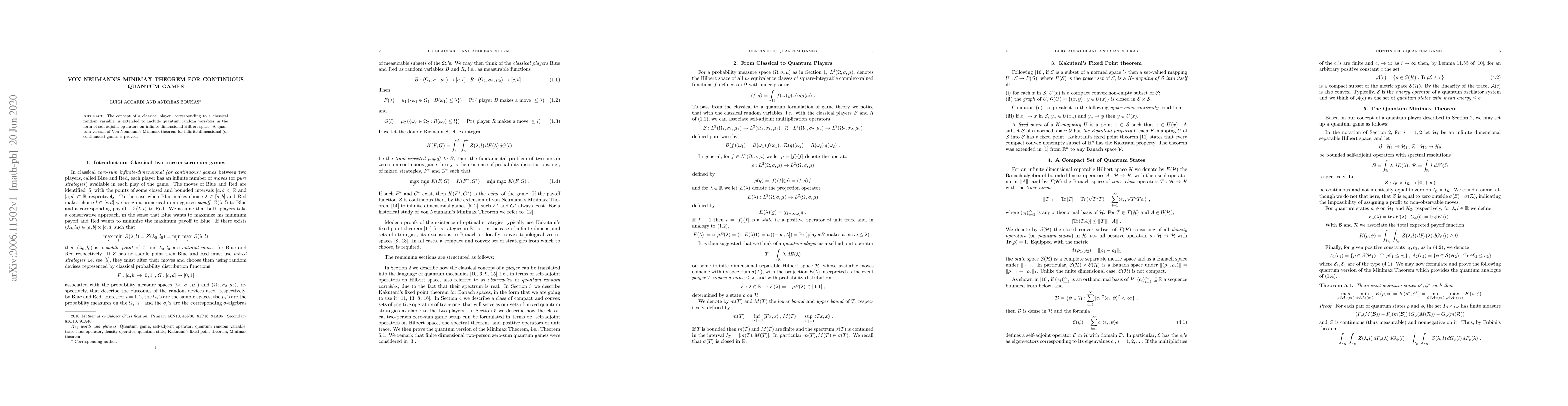 This paper extends classical player concepts to quantum random variables, proving a quantum version of von Neumann's Minimax theorem for continuous, infinite-dimensional games using self-adjoint operators on Hilbert spaces.