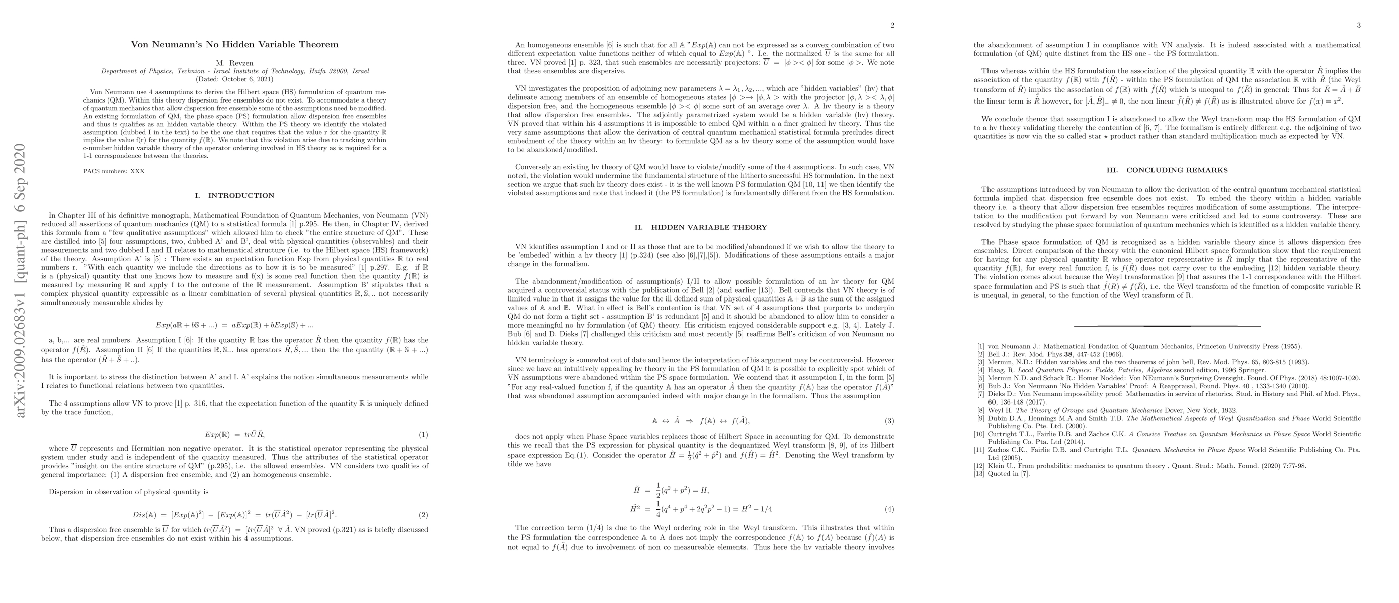 Von Neumann use 4 assumptions to derive the Hilbert space (HS) formulation of quantum mechanics (QM). Within this theory dispersion free ensembles do not exist. To accommodate a theory of quantum mechanics that allow dispersion free ensemble some of the assumptions need be modified. An existing formulation of QM, the phase space (PS) formulation allow dispersion free ensembles and thus is qualifies as an hidden variable theory. Within the PS theory we identify the violated assumption (dubbed I in the text) to be the one that requires that the value r for the quantity $\mathbb{R}$ implies the value f(r) for the quantity $f(\mathbb{R})$. We note that this violation arise due to tracking within c-number hidden variable theory of the operator ordering involved in HS theory as is required for a 1-1 correspondence between the theories.