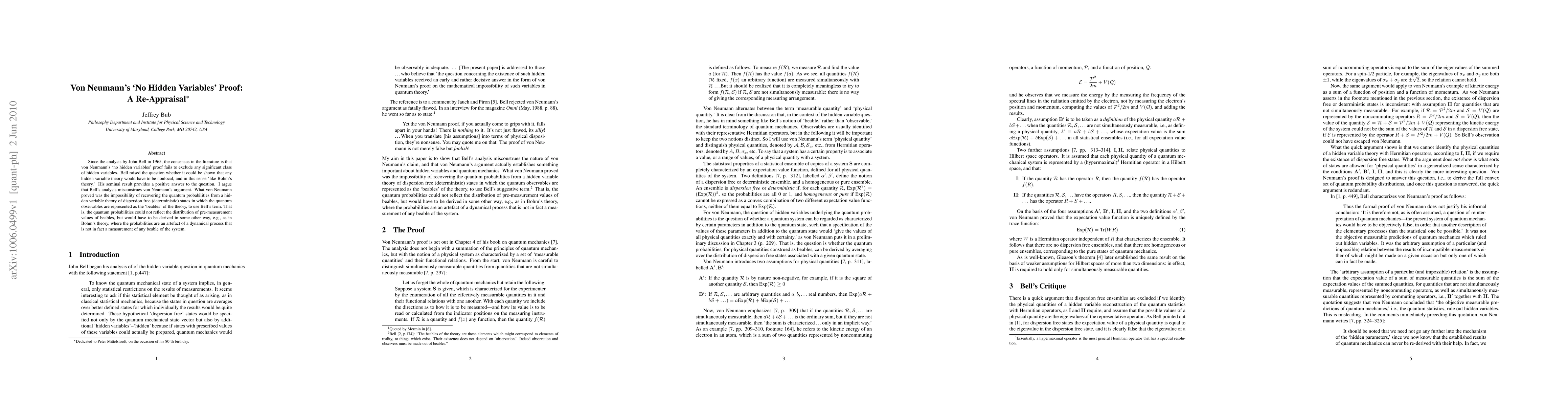 Since the analysis by John Bell in 1965, the consensus in the literature is that von Neumann's 'no hidden variables' proof fails to exclude any significant class of hidden variables. Bell raised the question whether it could be shown that any hidden variable theory would have to be nonlocal, and in this sense 'like Bohm's theory.' His seminal result provides a positive answer to the question. I argue that Bell's analysis misconstrues von Neumann's argument. What von Neumann proved was the impossibility of recovering the quantum probabilities from a hidden variable theory of dispersion free (deterministic) states in which the quantum observables are represented as the 'beables' of the theory, to use Bell's term. That is, the quantum probabilities could not reflect the distribution of pre-measurement values of beables, but would have to be derived in some other way, e.g., as in Bohm's theory, where the probabilities are an artefact of a dynamical process that is not in fact a measurement of any beable of the system.