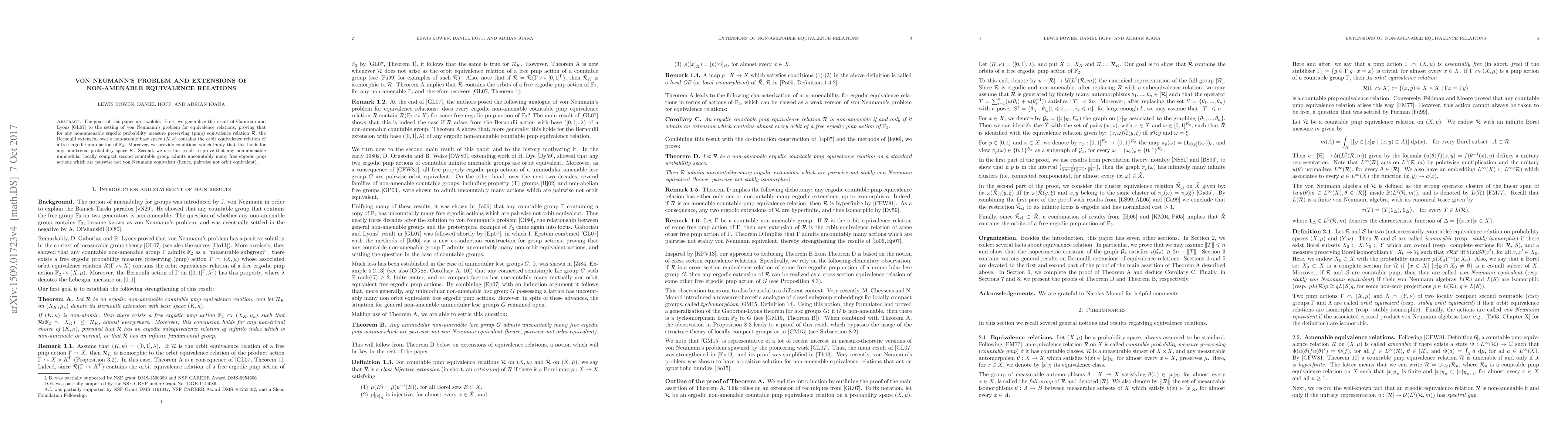 This paper generalizes Gaboriau and Lyons' result on von Neumann's problem for non-amenable ergodic equivalence relations, showing that their Bernoulli extensions contain orbit equivalence relations of free ergodic actions of $\mathbb{F}_2$. It also demonstrates that non-amenable unimodular locally compact second countable groups possess uncountably many pairwise non-von Neumann equivalent free ergodic pmp actions.