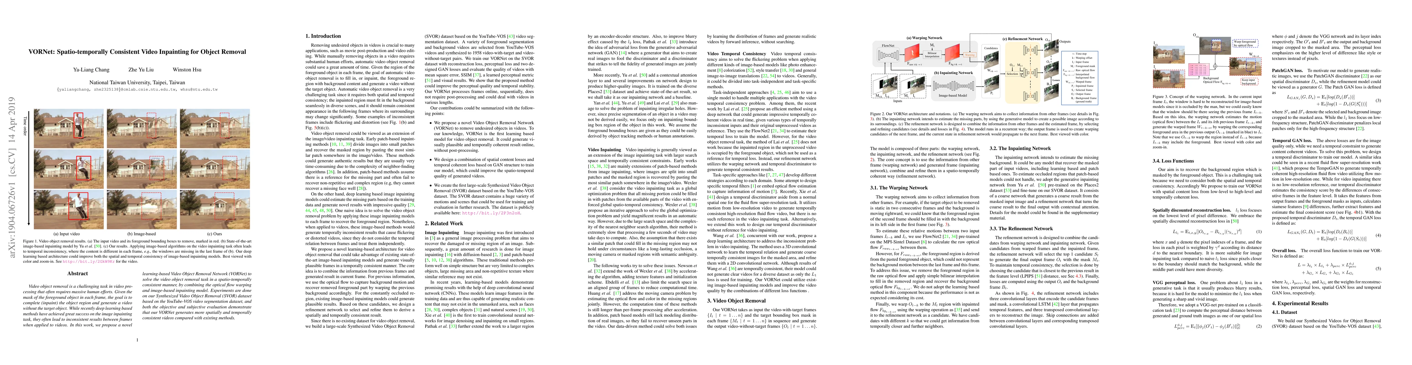 The paper proposes VORNet, a novel deep learning method for spatio-temporally consistent video object removal, combining optical flow warping and image-based inpainting to achieve frame-to-frame consistency. Experiments on the Synthesized Video Object Removal dataset show that VORNet outperforms existing methods in both objective and subjective evaluations.