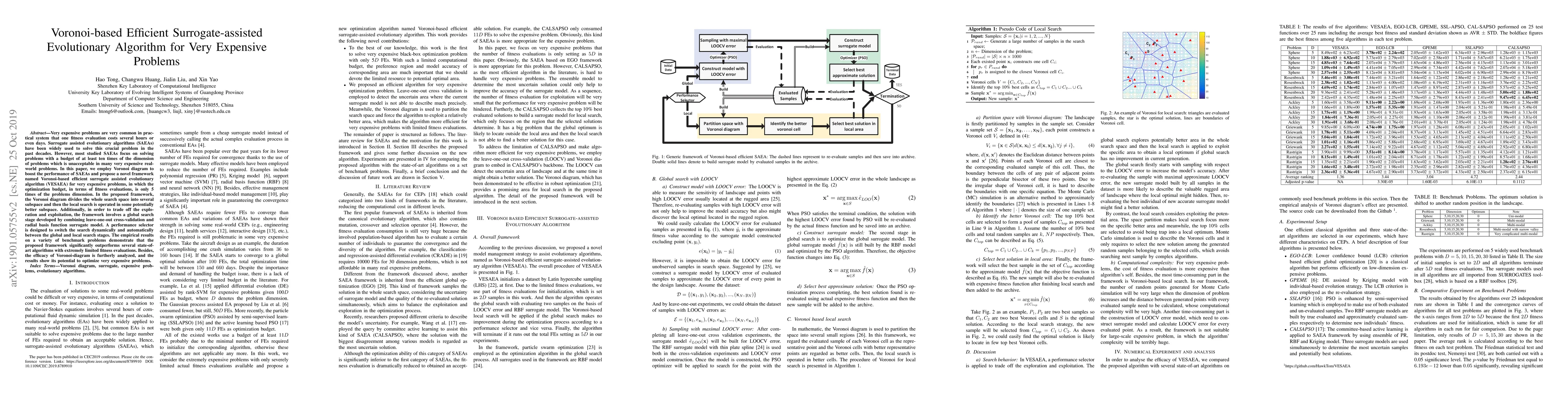 This paper introduces a Voronoi-based efficient surrogate-assisted evolutionary algorithm (VESAEA) to tackle very expensive optimization problems where each fitness evaluation is costly. The proposed framework significantly reduces the optimization budget to 5 times the problem's dimension by employing Voronoi diagrams to divide the search space and dynamically switching between local and global search strategies, outperforming state-of-the-art algorithms in benchmark tests.
