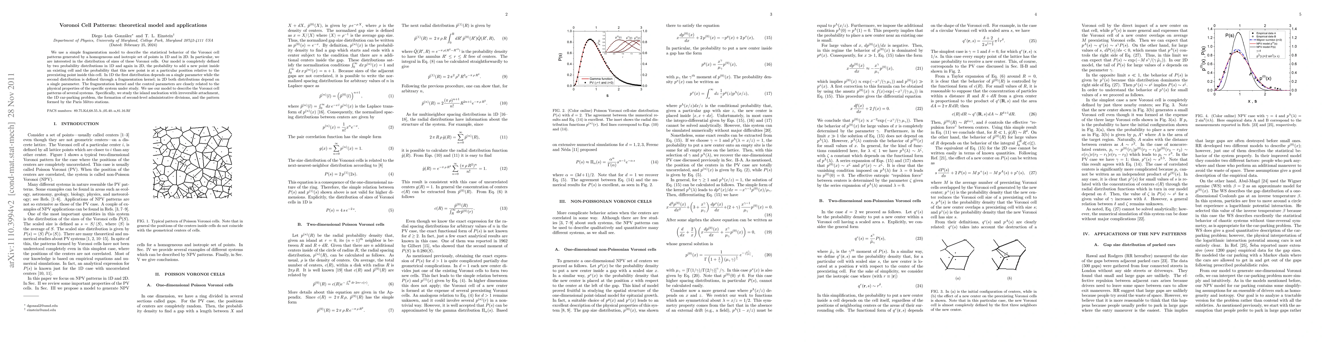 This paper presents a simple fragmentation model to analyze Voronoi cell patterns in 1D and 2D, defined by two probability distributions. The model is applied to various systems like island nucleation, car parking, administrative division formation, and Paris Métro station patterns, providing insights into their cell size distributions.