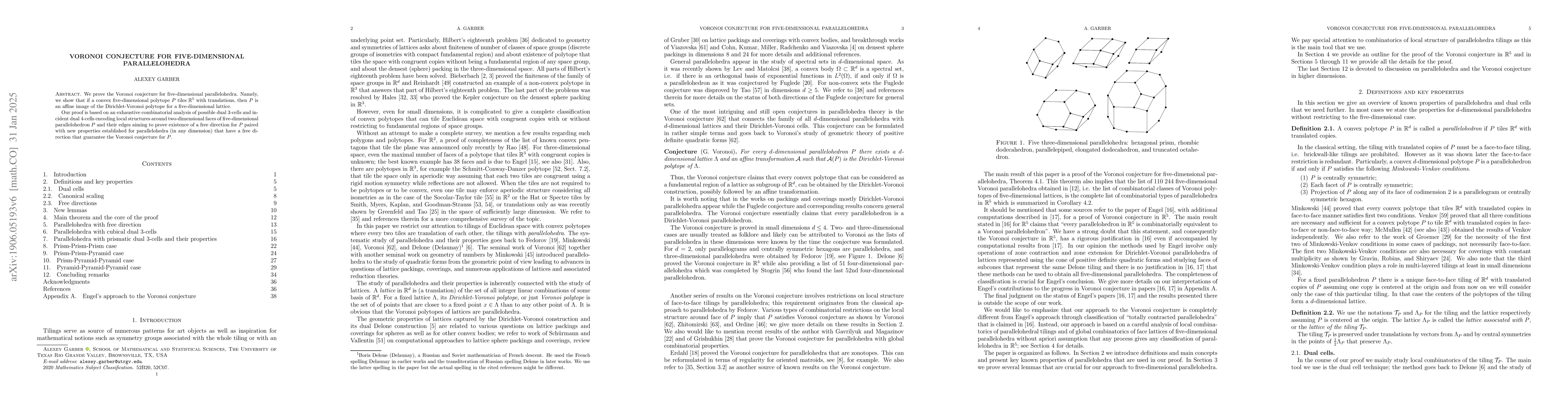 Summary: This paper proves the Voronoi conjecture for five-dimensional parallelohedra, demonstrating that any convex five-dimensional polytope $P$ that tiles $\mathbb{R}^5$ with translations must be an affine transformation of the Dirichlet-Voronoi polytope associated with a five-dimensional lattice.
