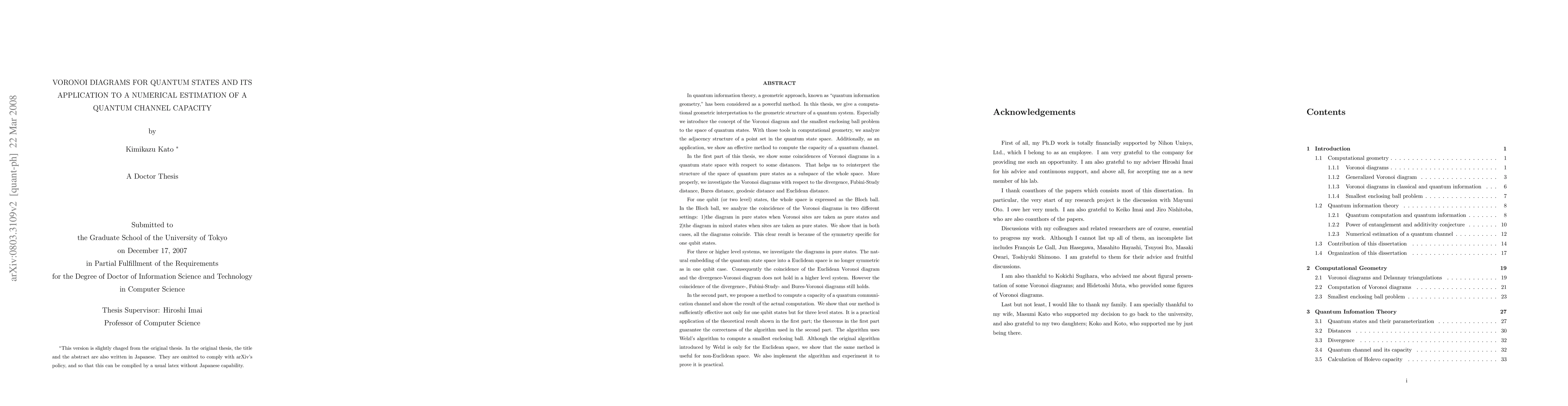 In quantum information theory, a geometric approach, known as "quantum information geometry," has been considered as a powerful method. In this thesis, we give a computational geometric interpretation to the geometric structure of a quantum system. Especially we introduce the concept of the Voronoi diagram and the smallest enclosing ball problem to the space of quantum states. With those tools in computational geometry, we analyze the adjacency structure of a point set in the quantum state space. Additionally, as an application, we show an effective method to compute the capacity of a quantum channel.