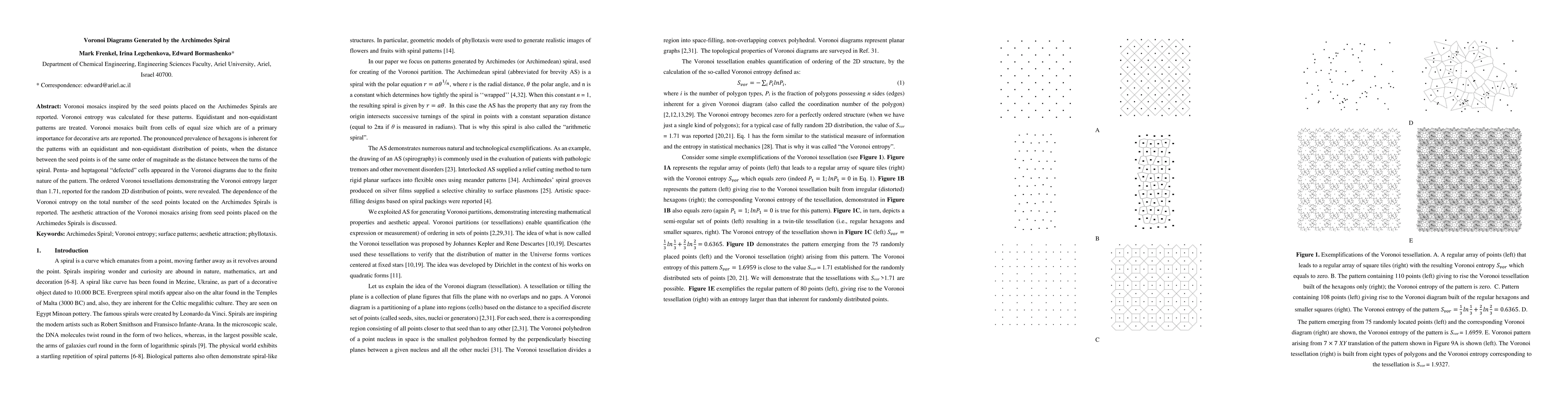 Voronoi mosaics inspired by the seed points placed on the Archimedes Spirals are reported. Voronoi entropy was calculated for these patterns. Equidistant and non-equidistant patterns are treated. Voronoi mosaics built from cells of equal size which are of primary importance for decorative arts are reported. The pronounced prevalence of hexagons is inherent for the patterns with an equidistant and non-equidistant distribution of points, when the distance between the seed points is of the same order of magnitude as the distance between the turns of the spiral. Penta- and heptagonal 'defected' cells appeared in the Voronoi diagrams due to the finite nature of the pattern. The ordered Voronoi tessellations demonstrating the Voronoi entropy larger than 1.71, reported for the random 2D distribution of points, were revealed. The dependence of the Voronoi entropy on the total number of the seed points located on the Archimedes Spirals is reported. The aesthetic attraction of the Voronoi mosaics arising from seed points placed on the Archimedes Spirals is discussed.