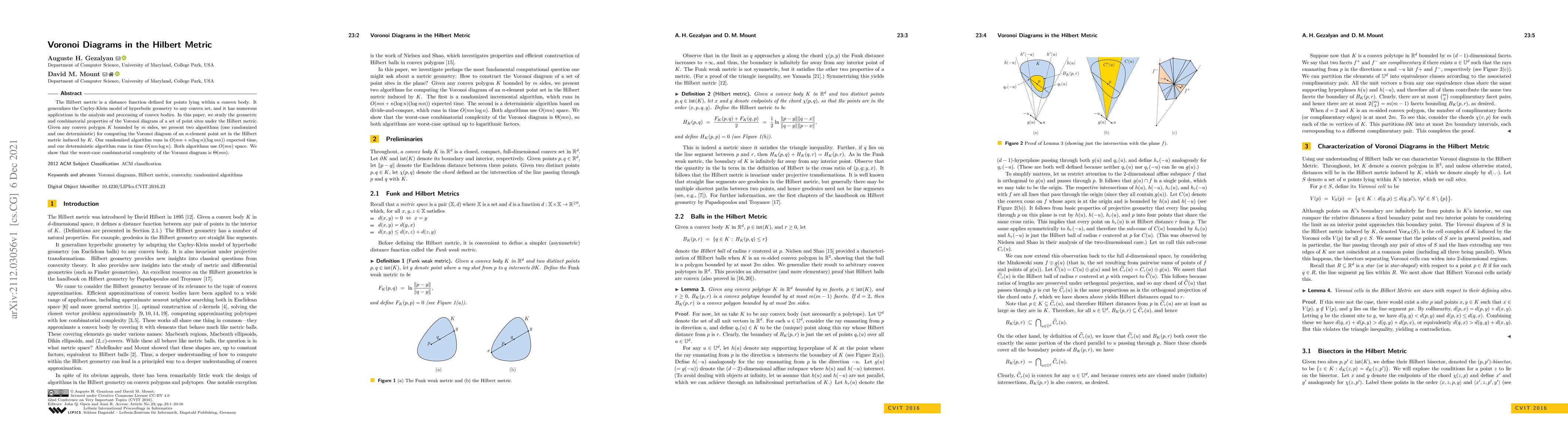 The Hilbert metric is a distance function defined for points lying within a convex body. It generalizes the Cayley-Klein model of hyperbolic geometry to any convex set, and it has numerous applications in the analysis and processing of convex bodies. In this paper, we study the geometric and combinatorial properties of the Voronoi diagram of a set of point sites under the Hilbert metric. Given any convex polygon $K$ bounded by $m$ sides, we present two algorithms (one randomized and one deterministic) for computing the Voronoi diagram of an $n$-element point set in the Hilbert metric induced by $K$. Our randomized algorithm runs in $O(m n + n (\log n)(\log m n))$ expected time, and our deterministic algorithm runs in time $O(m n \log n)$. Both algorithms use $O(m n)$ space. We show that the worst-case combinatorial complexity of the Voronoi diagram is $\Theta(m n)$.