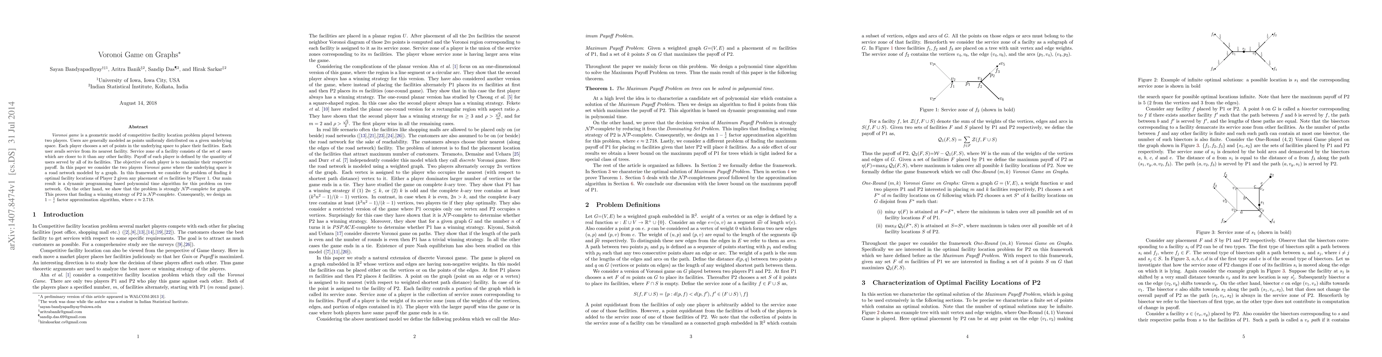 This paper explores the Voronoi game on graph-based road networks, where two players aim to maximize their respective payoffs by strategically placing facilities. The authors present a polynomial time algorithm for finding optimal facility locations on tree networks and prove the problem is strongly $\mathcal{NP}$-complete for general graphs. They also propose an $1-\frac{1}{e}$ factor approximation algorithm for the general case.