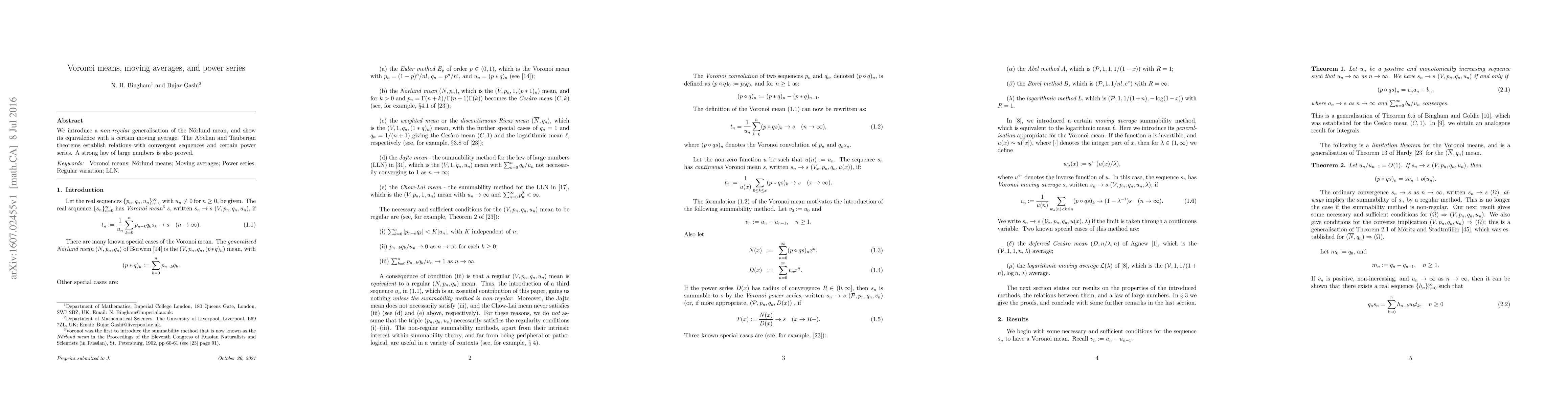 We introduce a {\it non-regular} generalisation of the N\"{o}rlund mean, and show its equivalence with a certain moving average. The Abelian and Tauberian theorems establish relations with convergent sequences and certain power series. A strong law of large numbers is also proved.