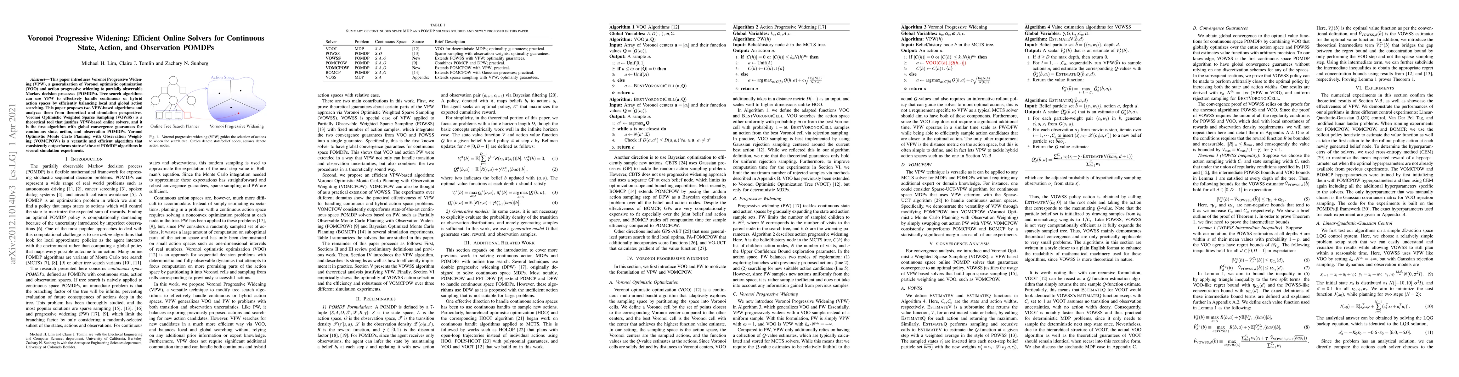 This paper presents Voronoi Progressive Widening (VPW), a novel approach for solving continuous state, action, and observation POMDPs, and proposes two VPW-based algorithms: Voronoi Optimistic Weighted Sparse Sampling (VOWSS) and Voronoi Optimistic Monte Carlo Planning with Observation Weighting (VOMCPOW), which outperform existing methods in simulations.