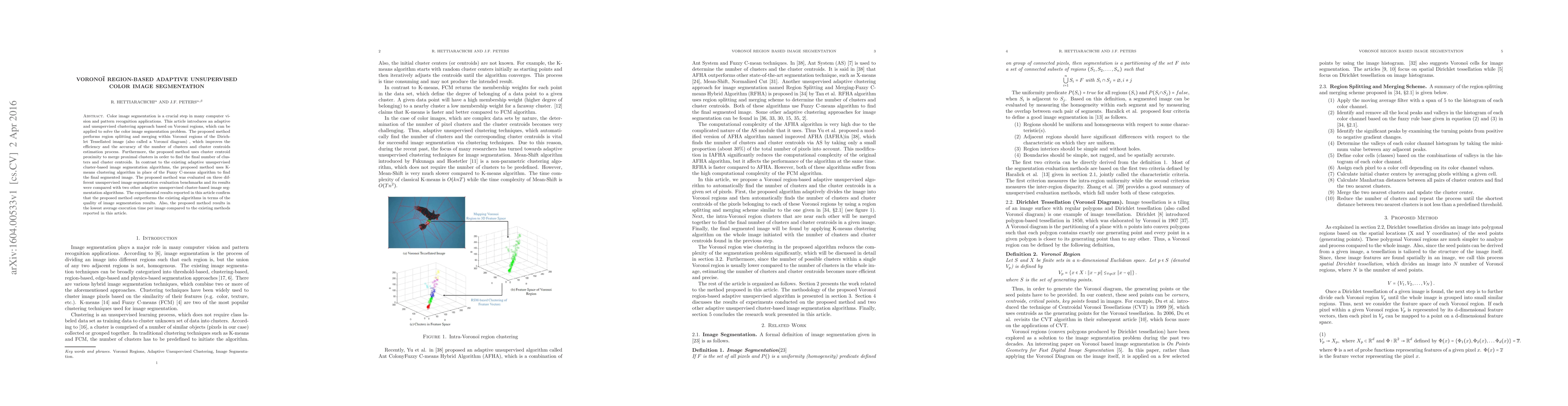 This paper proposes an adaptive, unsupervised color image segmentation method based on Voronoi regions, which enhances cluster estimation and merging efficiency. The method outperforms existing algorithms in segmentation quality and execution time, using K-means instead of Fuzzy C-means for final segmentation.