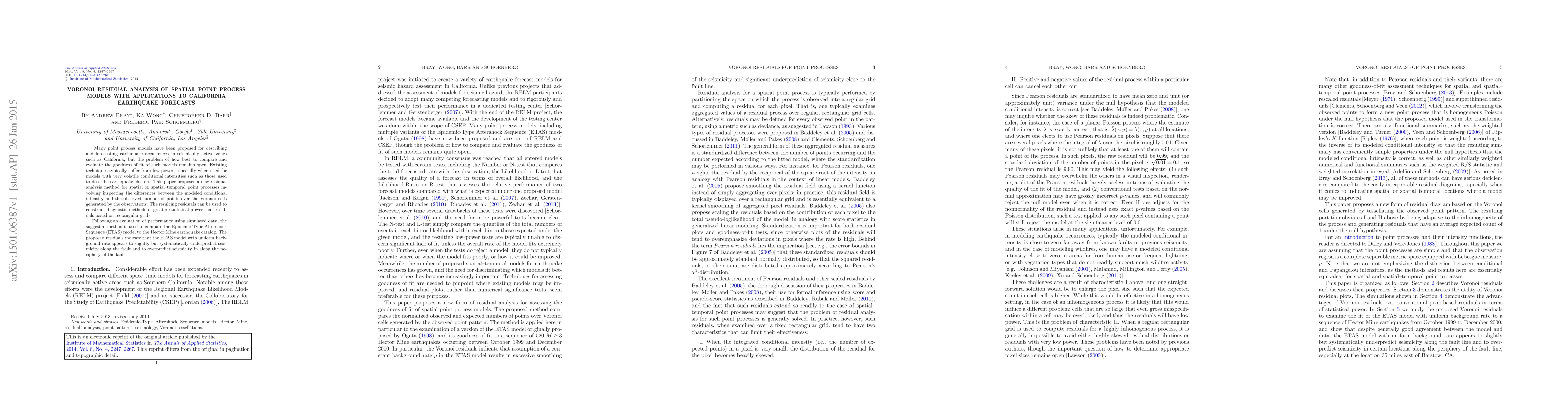This paper introduces a Voronoi residual analysis method to evaluate the fit of spatial point process models for earthquake forecasting, demonstrating greater statistical power than grid-based methods. The method is applied to compare the ETAS model against the Hector Mine earthquake catalog, revealing systematic underpredictions along the fault and overpredictions in its periphery.