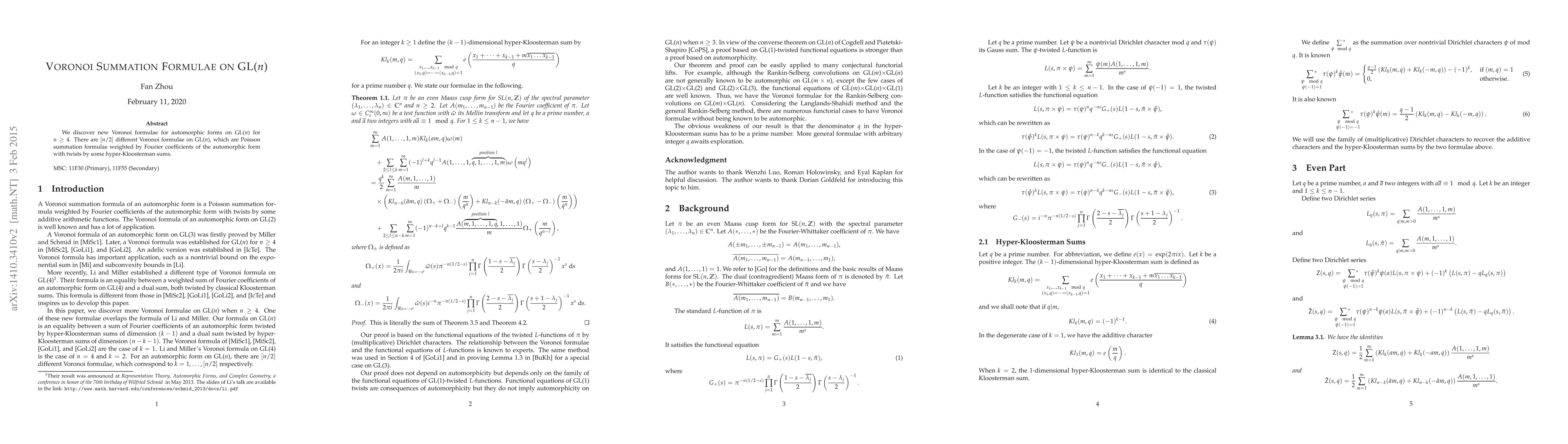 The paper introduces new Voronoi summation formulae for automorphic forms on GL(n) using functional equations, Dirichlet characters, and hyper-Kloosterman sums, along with associated technical lemmas and identities.