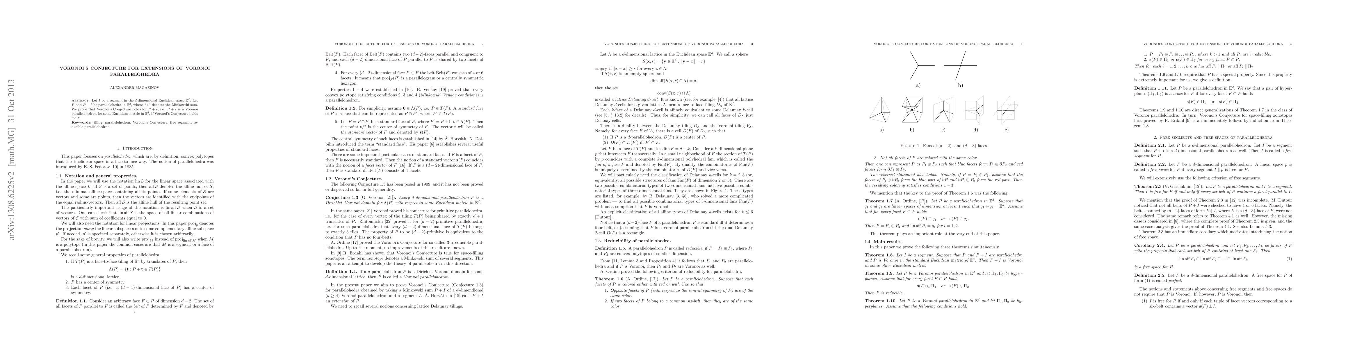 This paper proves that if Voronoi's Conjecture holds for a given parallelohedron $P$, it also holds for its extension $P+I$, where $I$ is a segment in the $d$-dimensional Euclidean space. Thus, Voronoi's Conjecture is preserved under Minkowski sum with a segment.