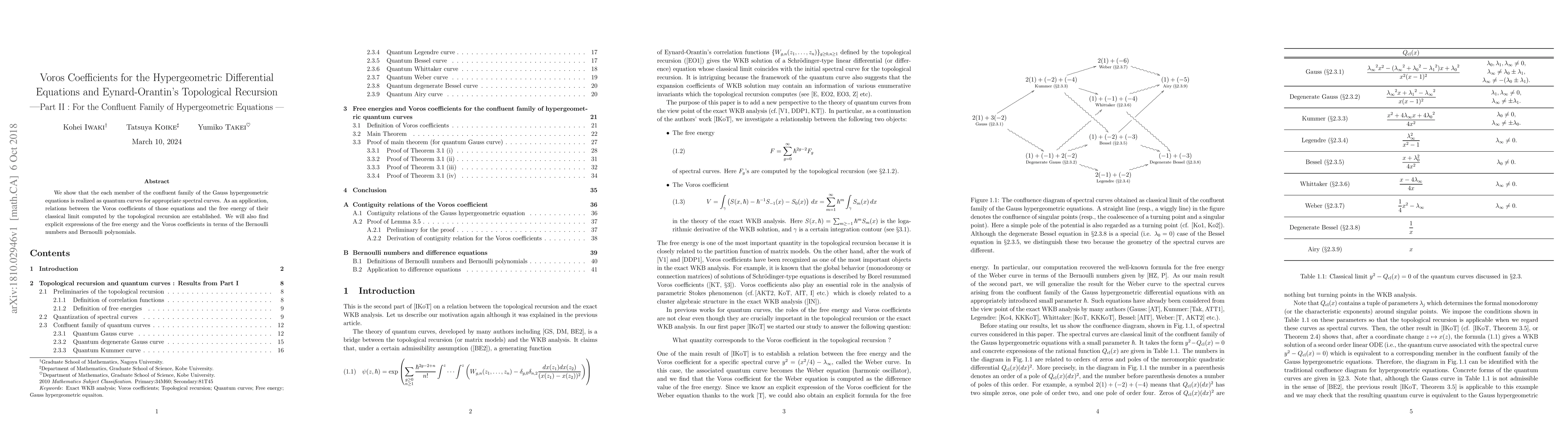 This paper demonstrates that each member of the confluent family of Gauss hypergeometric equations can be represented as quantum curves for specific spectral curves. It establishes connections between the Voros coefficients of these equations and the free energy derived from the topological recursion, providing explicit expressions for both in terms of Bernoulli numbers and Bernoulli polynomials.