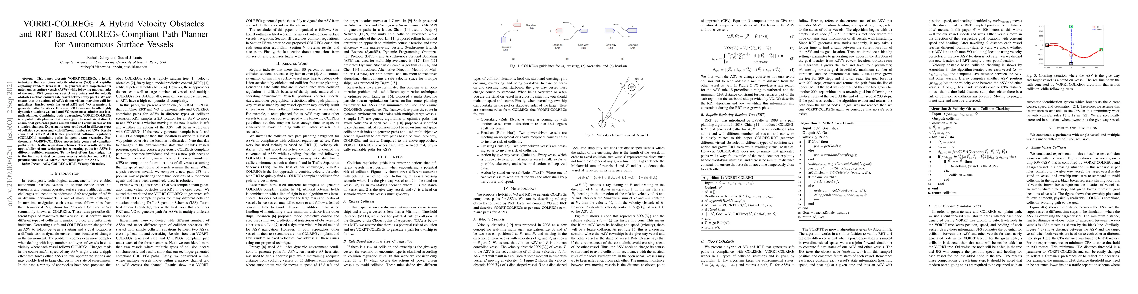 This paper introduces VORRT-COLREGs, a hybrid path planner combining velocity obstacles and RRT to generate safe, collision-free trajectories for autonomous surface vessels while adhering to maritime collision regulations. The approach ensures compliance with nautical rules of the road in dynamic scenarios.