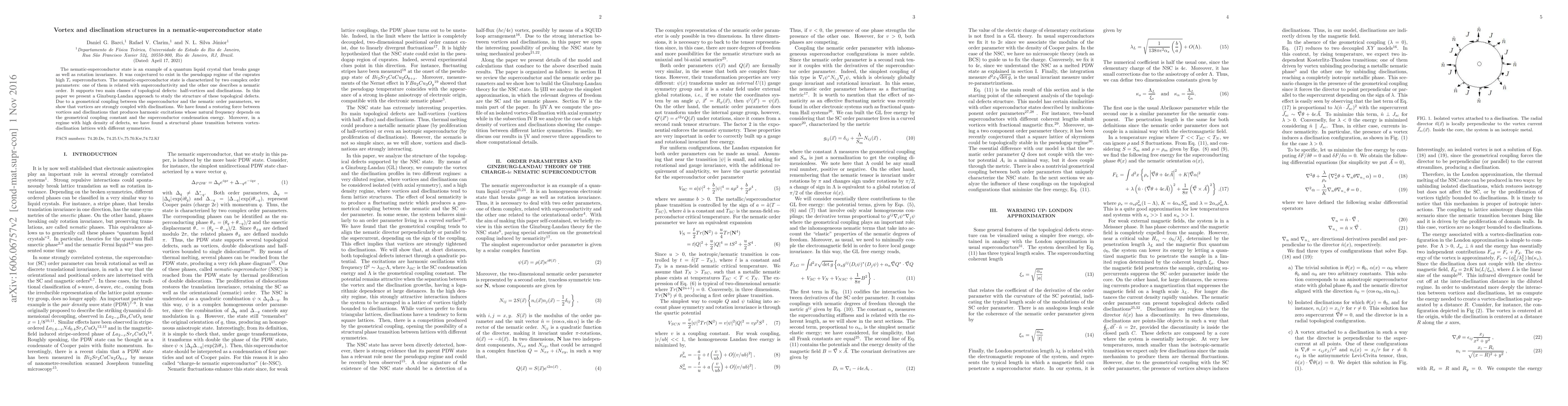 This paper explores the topological defects in a nematic-superconductor state, using a Ginzburg-Landau approach to reveal strong coupling between vortices and disclinations, leading to harmonic excitations and a structural phase transition in high defect density regimes.