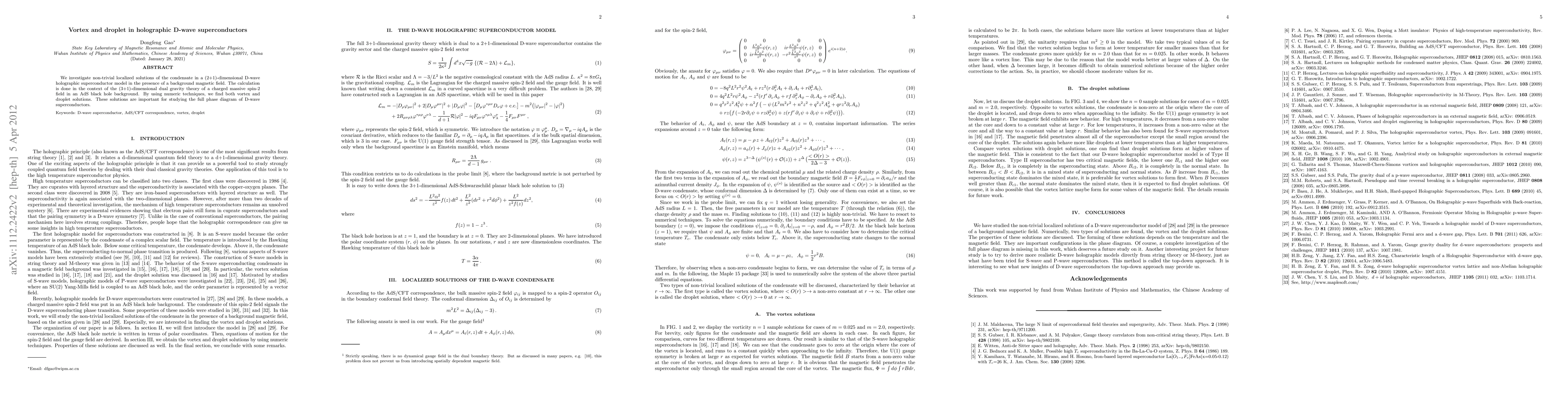 This paper explores vortex and droplet solutions in a (2+1)-dimensional D-wave holographic superconductor model under a magnetic field, employing (3+1)-dimensional dual gravity theory. Numerical techniques reveal these solutions, crucial for understanding the phase diagram of D-wave superconductors.