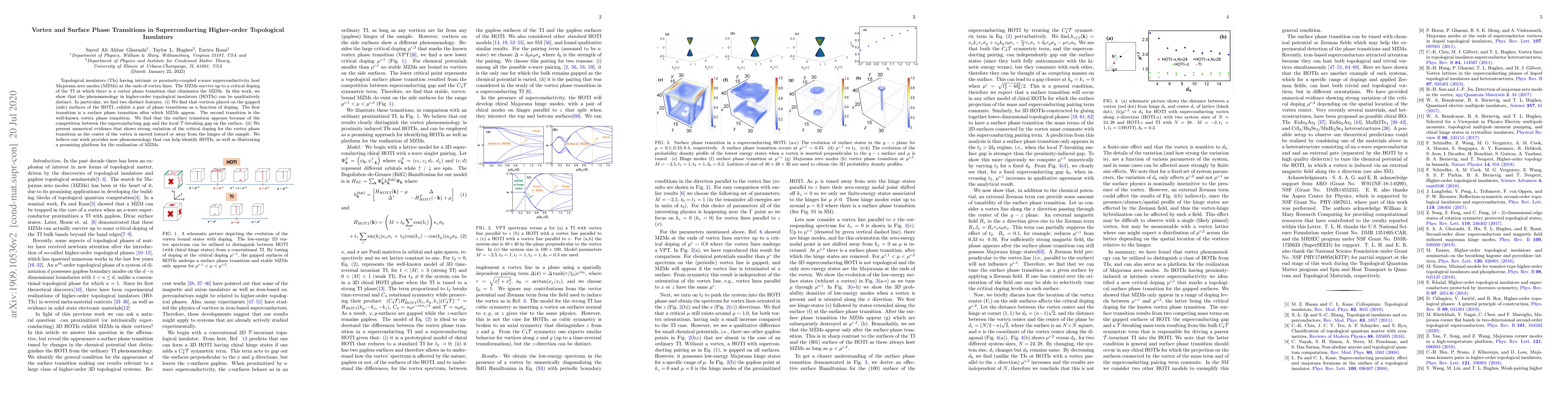 Researchers study vortex phase transitions in superconducting higher-order topological insulators, revealing two distinct features: a surface phase transition that appears due to competition between the superconducting gap and local $ au$-breaking gap, and strong variation of critical doping with the center of the vortex.