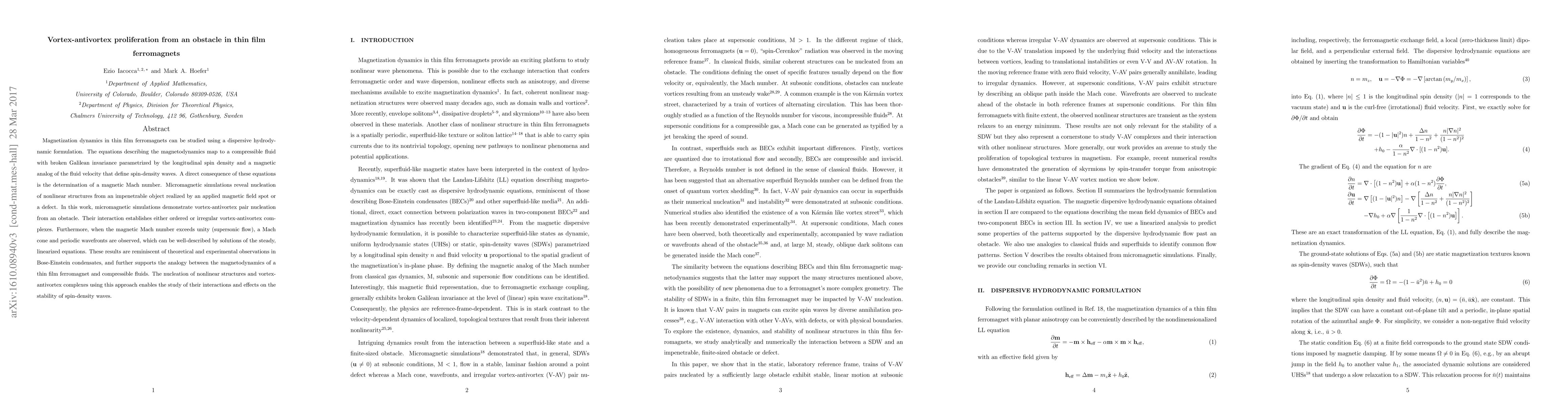 Magnetization dynamics in thin film ferromagnets can be studied using a dispersive hydrodynamic formulation. The equations describing the magnetodynamics map to a compressible fluid with broken Galilean invariance parametrized by the longitudinal spin density and a magnetic analog of the fluid velocity that define spin-density waves. A direct consequence of these equations is the determination of a magnetic Mach number. Micromagnetic simulations reveal nucleation of nonlinear structures from an impenetrable object realized by an applied magnetic field spot or a defect. In this work, micromagnetic simulations demonstrate vortex-antivortex pair nucleation from an obstacle. Their interaction establishes either ordered or irregular vortex-antivortex complexes. Furthermore, when the magnetic Mach number exceeds unity (supersonic flow), a Mach cone and periodic wavefronts are observed, which can be well-described by solutions of the steady, linearized equations. These results are reminiscent of theoretical and experimental observations in Bose-Einstein condensates, and further supports the analogy between the magnetodynamics of a thin film ferromagnet and compressible fluids. The nucleation of nonlinear structures and vortex-antivortex complexes using this approach enables the study of their interactions and effects on the stability of spin-density waves.