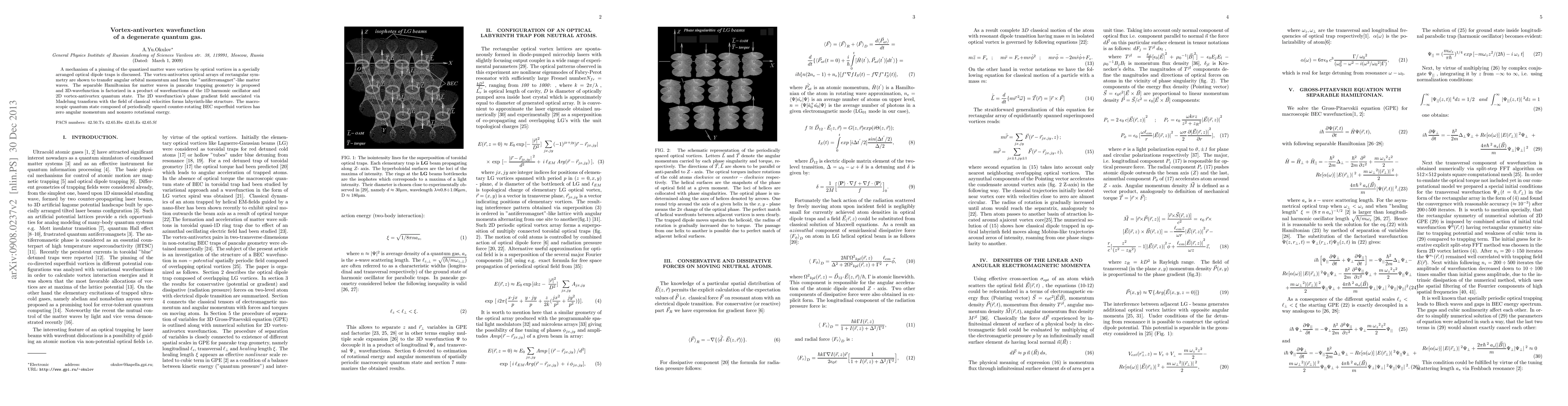 This paper explores a mechanism for pinning quantized matter wave vortices in a degenerate quantum gas using optical vortices in dipole traps. It proposes a separable Hamiltonian and demonstrates how vortex-antivortex arrays can form "antiferromagnet"-like matter waves, resulting in a labyrinth-like phase gradient field and a macroscopic quantum state with zero angular momentum but nonzero rotational energy.