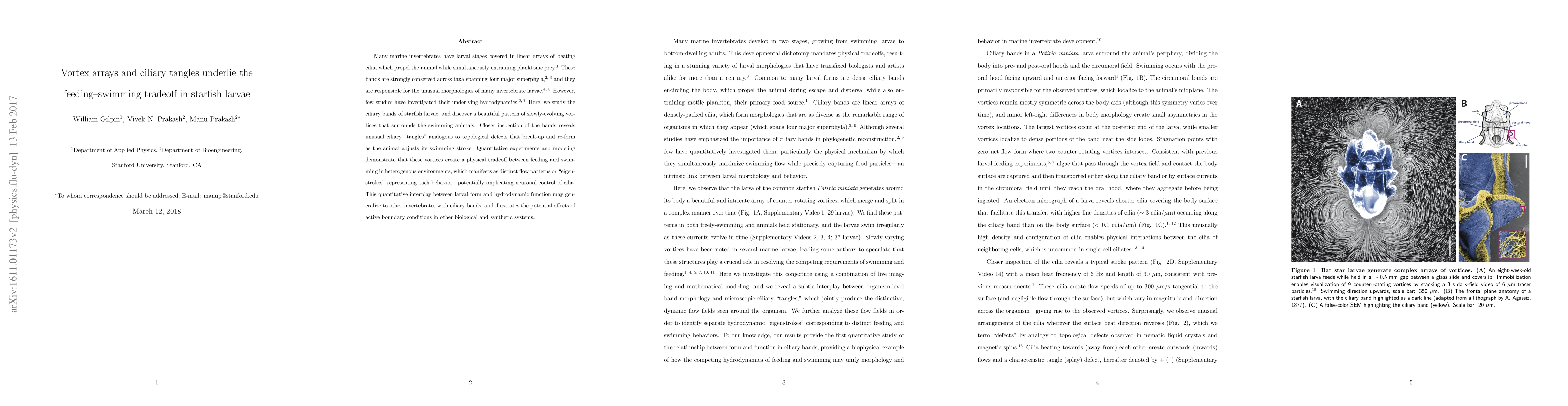 Many marine invertebrates have larval stages covered in linear arrays of beating cilia, which propel the animal while simultaneously entraining planktonic prey. These bands are strongly conserved across taxa spanning four major superphyla, and they are responsible for the unusual morphologies of many invertebrate larvae. However, few studies have investigated their underlying hydrodynamics. Here, we study the ciliary bands of starfish larvae, and discover a beautiful pattern of slowly-evolving vortices that surrounds the swimming animals. Closer inspection of the bands reveals unusual ciliary "tangles" analogous to topological defects that break up and re-form as the animal adjusts its swimming stroke. Quantitative experiments and modeling demonstrate that these vortices create a physical tradeoff between feeding and swimming in heterogenous environments, which manifests as distinct flow patterns or "eigen-strokes" representing each behavior---potentially implicating neuronal control of cilia. This quantitative interplay between larval form and hydrodynamic function may generalize to other invertebrates with ciliary bands, and illustrates the potential effects of active boundary conditions in other biological and synthetic systems.