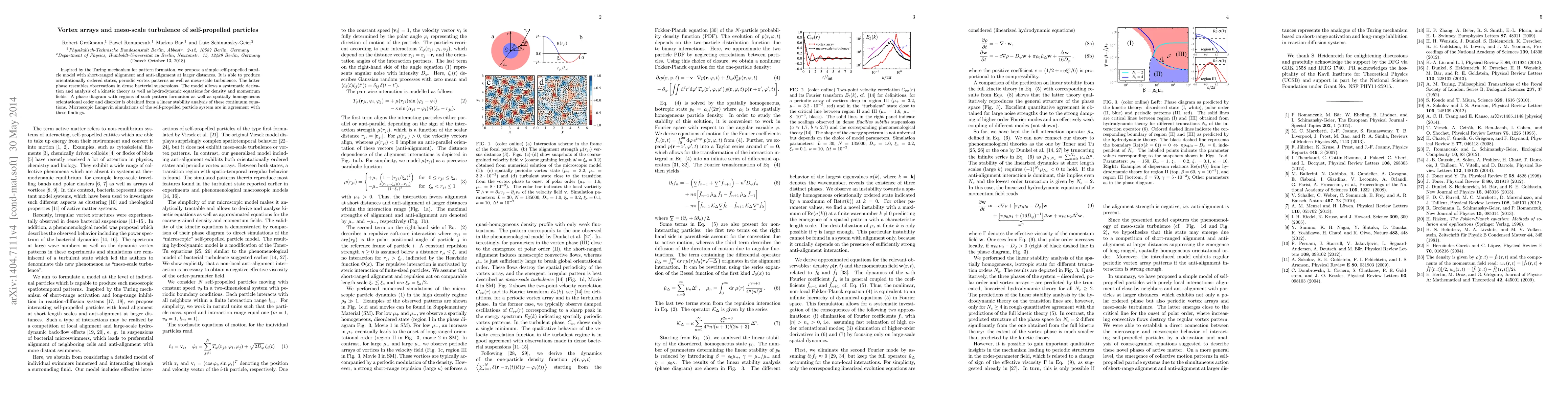 Inspired by the Turing mechanism for pattern formation, we propose a simple self-propelled particle model with short-ranged alignment and anti-alignment at larger distances. It is able to produce orientationally ordered states, periodic vortex patterns as well as meso-scale turbulence. The latter phase resembles observations in dense bacterial suspensions. The model allows a systematic derivation and analysis of a kinetic theory as well as hydrodynamic equations for density and momentum fields. A phase diagram with regions of such pattern formation as well as spatially homogeneous orientational order and disorder is obtained from a linear stability analysis of these continuum equations. Microscopic Langevin simulations of the self-propelled particle system are in agreement with these findings.
