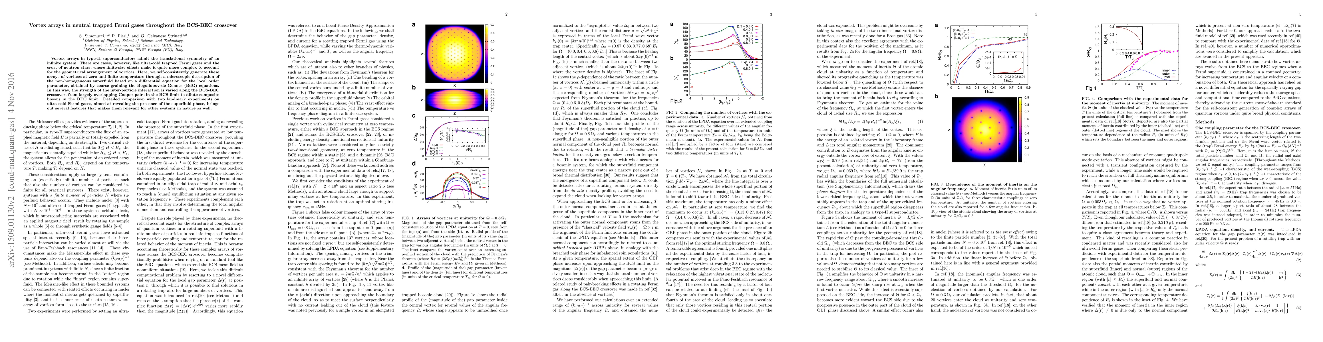 Vortex arrays in type-II superconductors admit the translational symmetry of an infinite system. There are cases, however, like ultra-cold trapped Fermi gases and the crust of neutron stars, where finite-size effects make it quite more complex to account for the geometrical arrangement of vortices. Here, we self-consistently generate these arrays of vortices at zero and finite temperature through a microscopic description of the non-homogeneous superfluid based on a differential equation for the local order parameter, obtained by coarse graining the Bogoliubov-de Gennes (BdG) equations. In this way, the strength of the inter-particle interaction is varied along the BCS-BEC crossover, from largely overlapping Cooper pairs in the BCS limit to dilute composite bosons in the BEC limit. Detailed comparison with two landmark experiments on ultra-cold Fermi gases, aimed at revealing the presence of the superfluid phase, brings out several features that makes them relevant for other systems in nature as well.