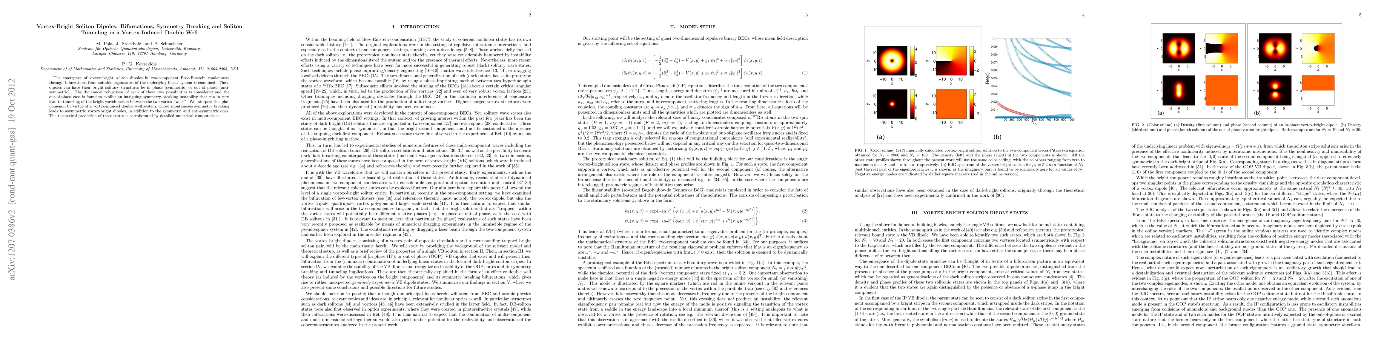 This paper investigates vortex-bright soliton dipoles in Bose-Einstein condensates, focusing on bifurcations and symmetry-breaking phenomena. It reveals that out-of-phase dipoles exhibit a symmetry-breaking instability leading to tunneling between vortex "wells," corroborated by numerical simulations.