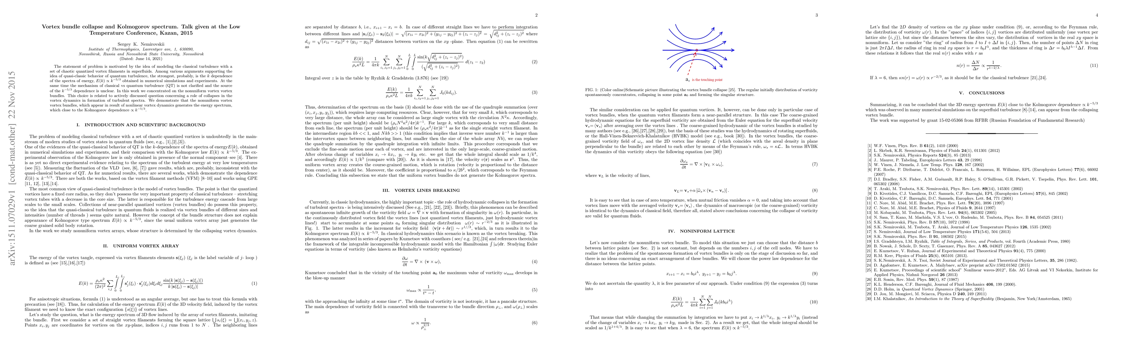 This paper explores the dynamics of vortex bundles in superfluids, focusing on their collapse mechanism and its role in generating a Kolmogorov-like energy spectrum, $E(k) \propto k^{-5/3}$, akin to classical turbulence. The study aims to clarify the transition between classical and quantum turbulence.