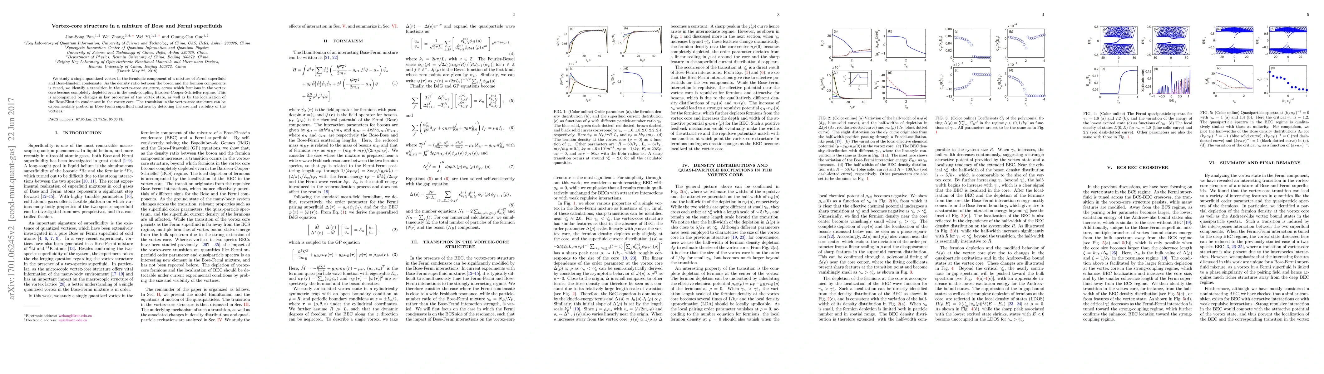 This study investigates a single quantized vortex in a mixture of Bose and Fermi superfluids, revealing a transition in the vortex-core structure as the density ratio between bosons and fermions changes. This transition leads to complete depletion of fermions in the vortex core, accompanied by changes in vortex properties and localization of the Bose-Einstein condensate, detectable via vortex size and visibility.