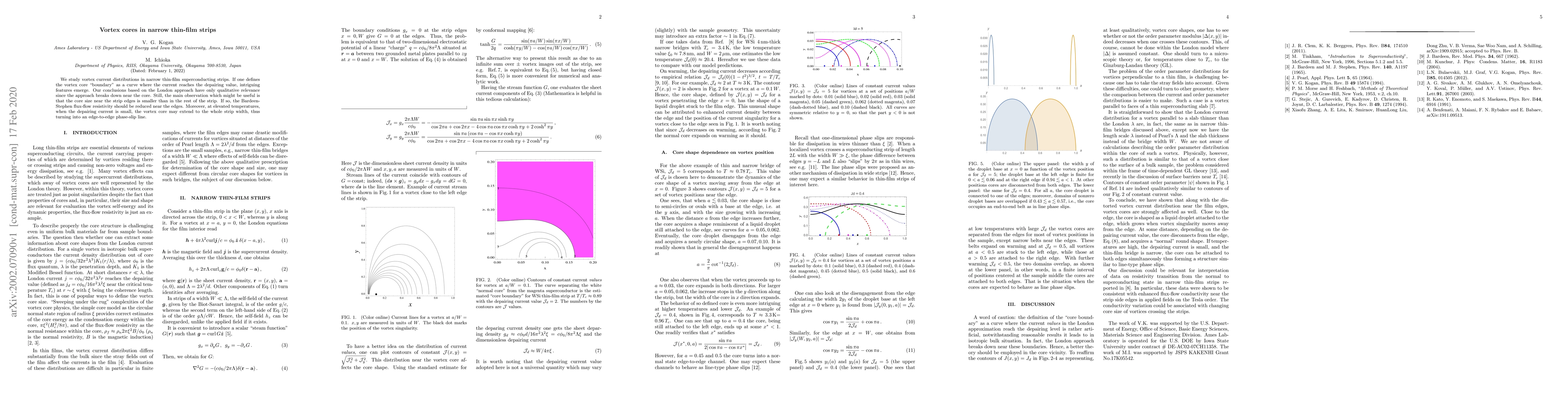 We study vortex current distributions in narrow thin-film superconducting strips. If one defines the vortex core ``boundary" as a curve where the current reaches the depairing value, intriguing features emerge. Our conclusions based on the London approach have only qualitative relevance since the approach breaks down near the core. Still, the main observation which might be useful is that the core size near the strip edges is smaller than in the rest of the strip. If so, the Bardeen-Stephen flux-flow resistivity should be reduced near the edges. Moreover, at elevated temperatures, when the depairing current is small, the vortex core may extend to the whole strip width, thus turning into an edge-to-edge phase-slip line.