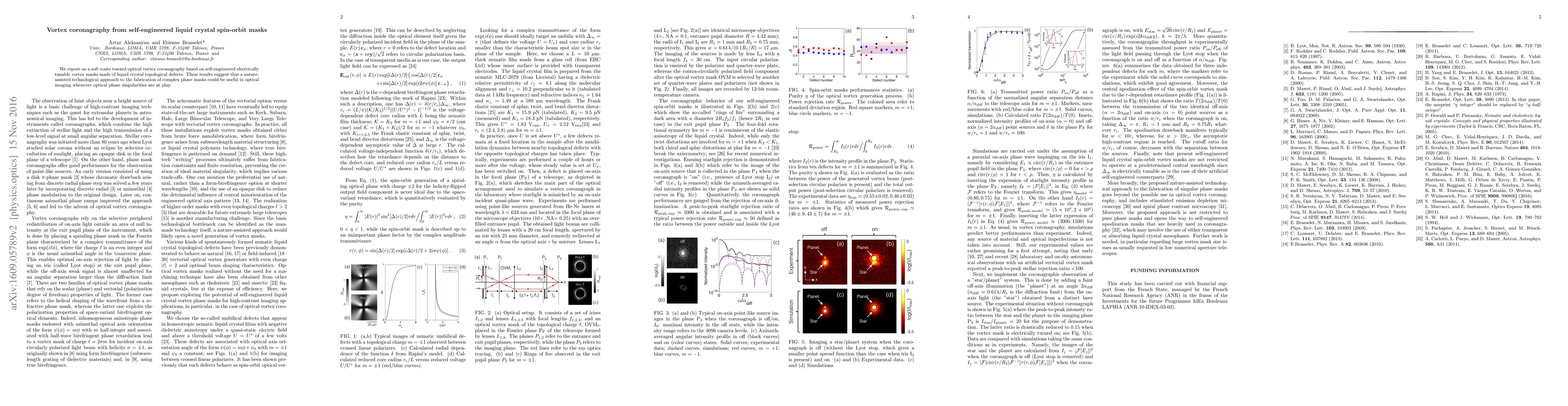 We report on a soft route towards optical vortex coronagraphy based on self-engineered electrically tunable vortex masks based on liquid crystal topological defects. These results suggest that a nature-assisted technological approach to the fabrication of complex phase masks could be useful in optical imaging whenever optical phase singularities are at play.