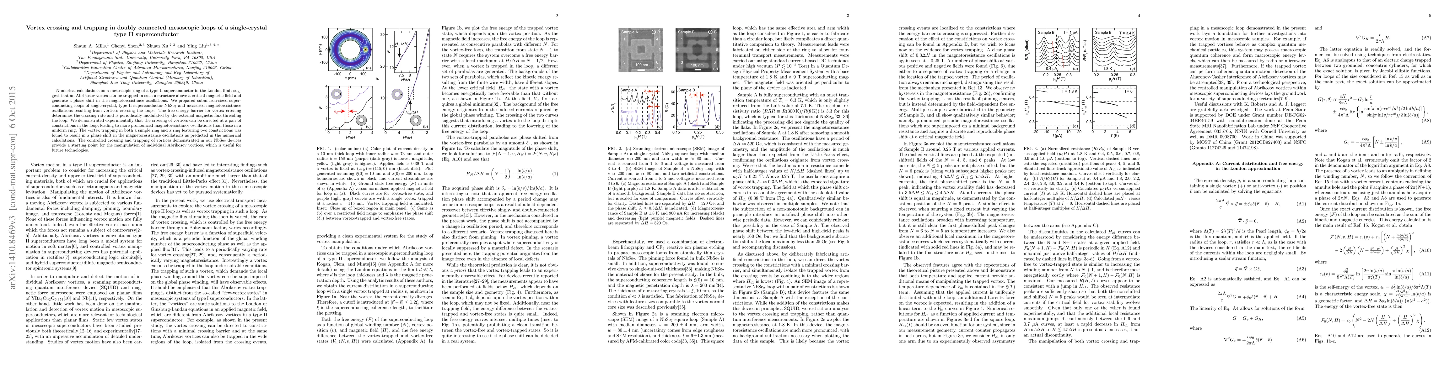 Numerical calculations on a mesoscopic ring of a type II superconductor in the London limit suggest that an Abrikosov vortex can be trapped in such a structure above a critical magnetic field and generate a phase shift in the magnetoresistance oscillations. We prepared submicron-sized superconducting loops of single-crystal, type II superconductor NbSe$_2$ and measured magnetoresistance oscillations resulting from vortices crossing the loops. The free energy barrier for vortex crossing determines the crossing rate and is periodically modulated by the external magnetic flux threading the loop. We demonstrated experimentally that the crossing of vortices can be directed at a pair of constrictions in the loop, leading to more pronounced magnetoresistance oscillations than those in a uniform ring. The vortex trapping in both a simple ring and a ring featuring two constrictions was found to result in a phase shift in the magnetoresistance oscillations as predicted in the numerical calculations. The controlled crossing and trapping of vortices demonstrated in our NbSe$_2$ devices provide a starting point for the manipulation of individual Abrikosov vortices, which is useful for future technologies.