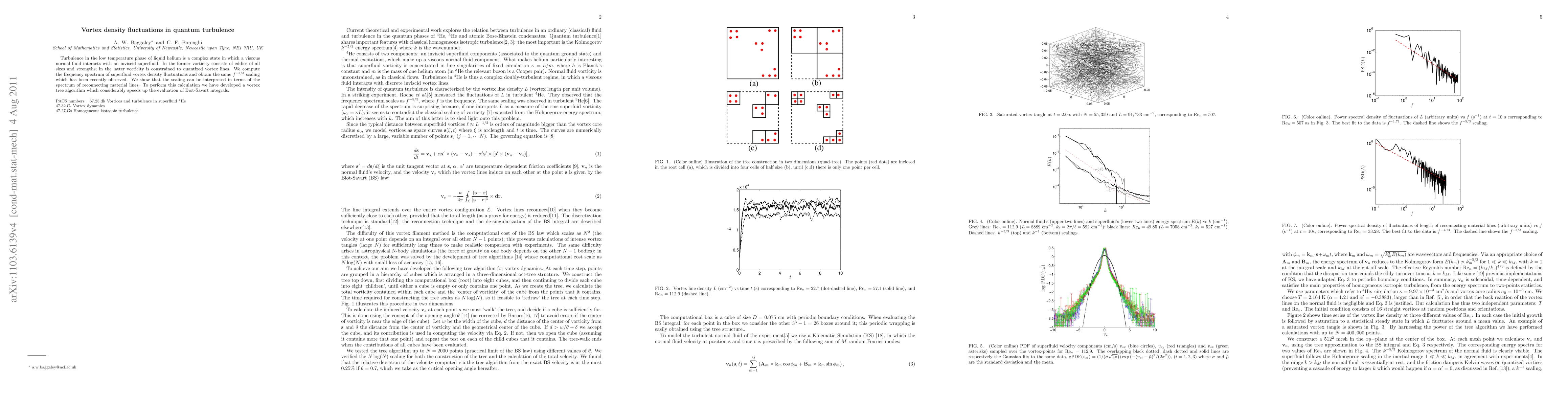 This paper computes the frequency spectrum of vortex density fluctuations in quantum turbulence, demonstrating Kolmogorov scaling observed in Helium-4 experiments. The study uses a vortex tree algorithm to efficiently evaluate Biot-Savart integrals, linking the scaling to the spectrum of reconnecting material lines.