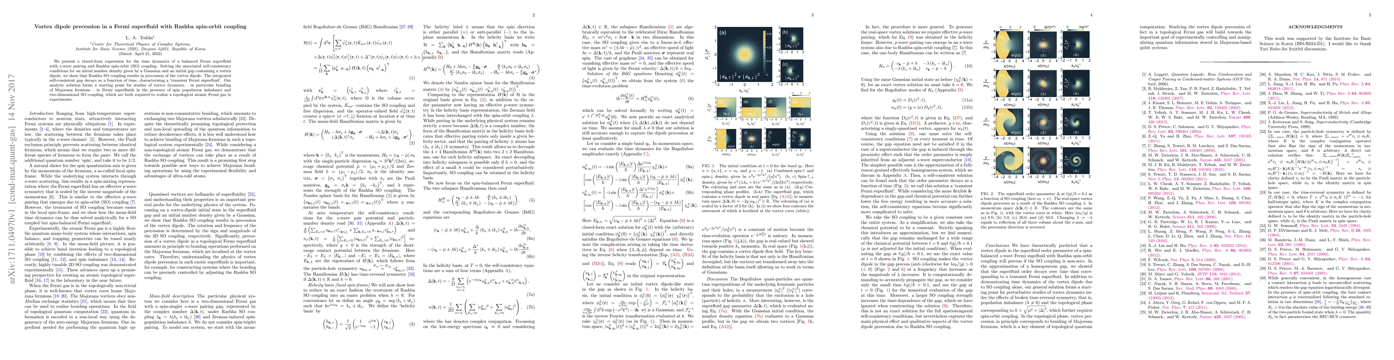 We present a closed-form expression for the time dynamics of a balanced Fermi superfluid with s-wave pairing and Rashba spin-orbit (SO) coupling. Solving the associated self-consistency conditions for an initial number density given by a Gaussian and an initial gap containing a vortex dipole, we show that Rashba SO coupling results in precession of the vortex dipole. The integrated self-consistent gap decays as a function of time, characterising a "transient Fermi superfluid". Our analytic solution forms a starting point for studies of vortex dynamics -- in particular braiding of Majorana fermions -- in Fermi superfluids in the presence of spin population imbalance and two-dimensional SO coupling, which are both required to realize a topological atomic Fermi gas in experiments.