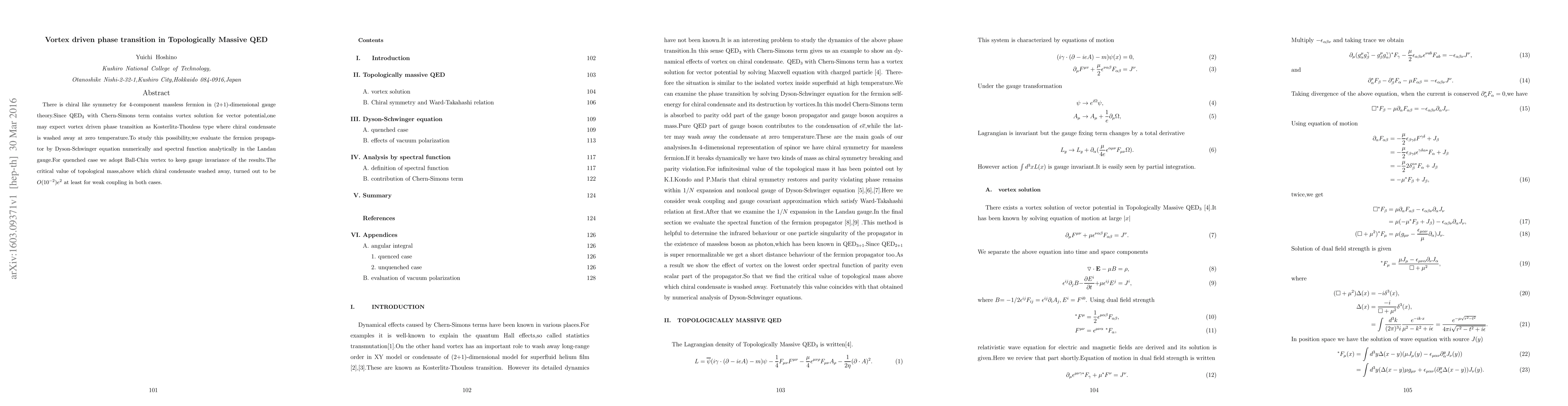 There is chiral like symmetry for 4-component massless fermion in (2+1)-dimensional gauge theory.Since QED$_{3}$ with Chern-Simons term contains vortex solution for vector potential,one may expect vortex driven phase transition as Kosterlitz-Thouless type where chiral condensate is washed away at zero temperature.To study this possibility,we evaluate the fermion propagator by Dyson-Schwinger equation numerically and spectral function analytically in the Landau gauge.For quenched case we adopt Ball-Chiu vertex to keep gauge invariance of the results.The critical value of topological mass,above which chiral condensate washed away, turned out to be $O(10^{-2})e^{2}$ at least for weak coupling in both cases.