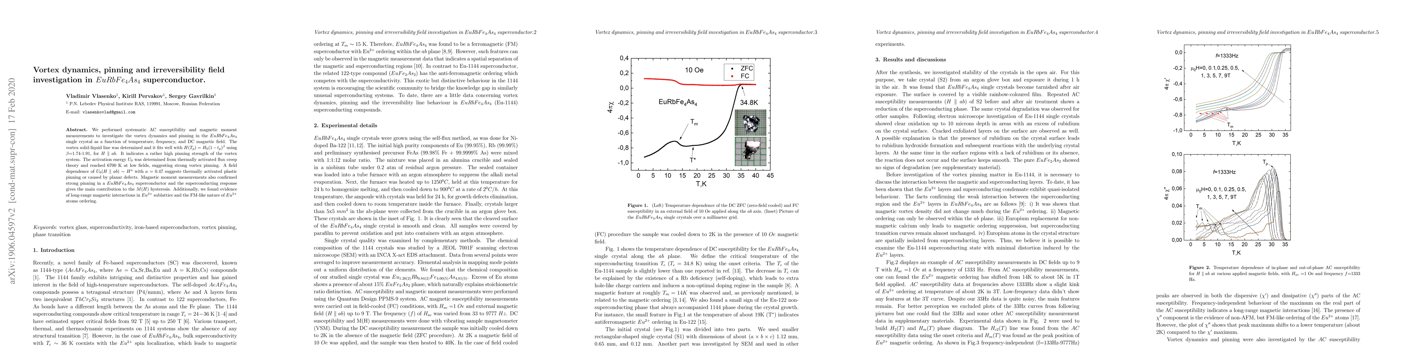 This study investigates vortex dynamics and pinning in the $EuRbFe_4As_4$ superconductor using AC susceptibility and magnetic moment measurements. The results show strong vortex pinning, with an activation energy of 6700 K and evidence of long-range magnetic interactions in the $Eu^{2+}$ sublattice.