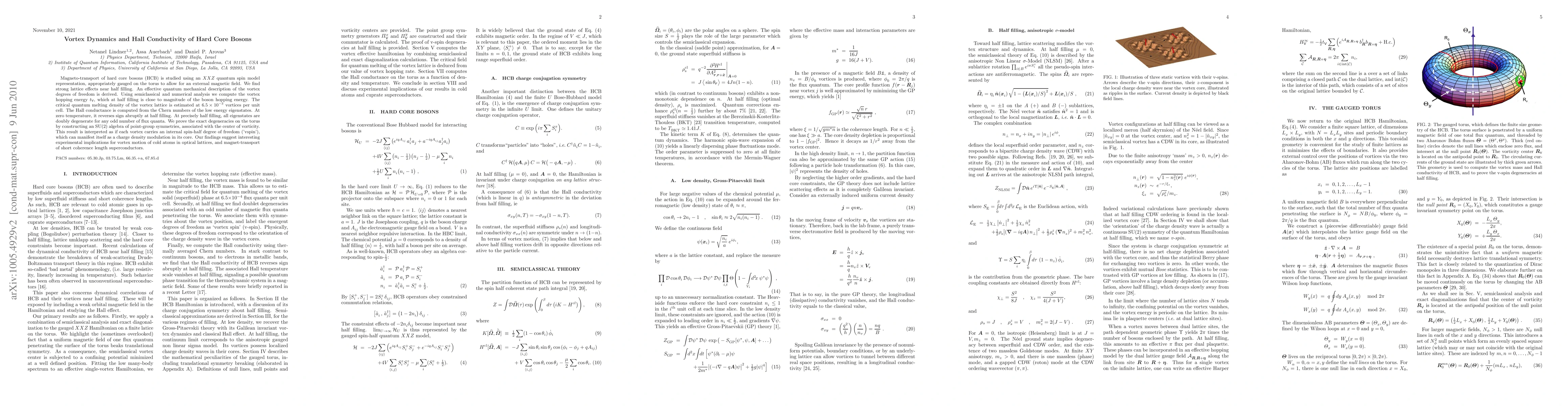 Magneto-transport of hard core bosons (HCB) is studied using an XXZ quantum spin model representation, appropriately gauged on the torus to allow for an external magnetic field. We find strong lattice effects near half filling. An effective quantum mechanical description of the vortex degrees of freedom is derived. Using semiclassical and numerical analysis we compute the vortex hopping energy, which at half filling is close to magnitude of the boson hopping energy. The critical quantum melting density of the vortex lattice is estimated at 6.5x10-5 vortices per unit cell. The Hall conductance is computed from the Chern numbers of the low energy eigenstates. At zero temperature, it reverses sign abruptly at half filling. At precisely half filling, all eigenstates are doubly degenerate for any odd number of flux quanta. We prove the exact degeneracies on the torus by constructing an SU(2) algebra of point-group symmetries, associated with the center of vorticity. This result is interpreted as if each vortex carries an internal spin-half degree of freedom ('vspin'), which can manifest itself as a charge density modulation in its core. Our findings suggest interesting experimental implications for vortex motion of cold atoms in optical lattices, and magnet-transport of short coherence length superconductors.
