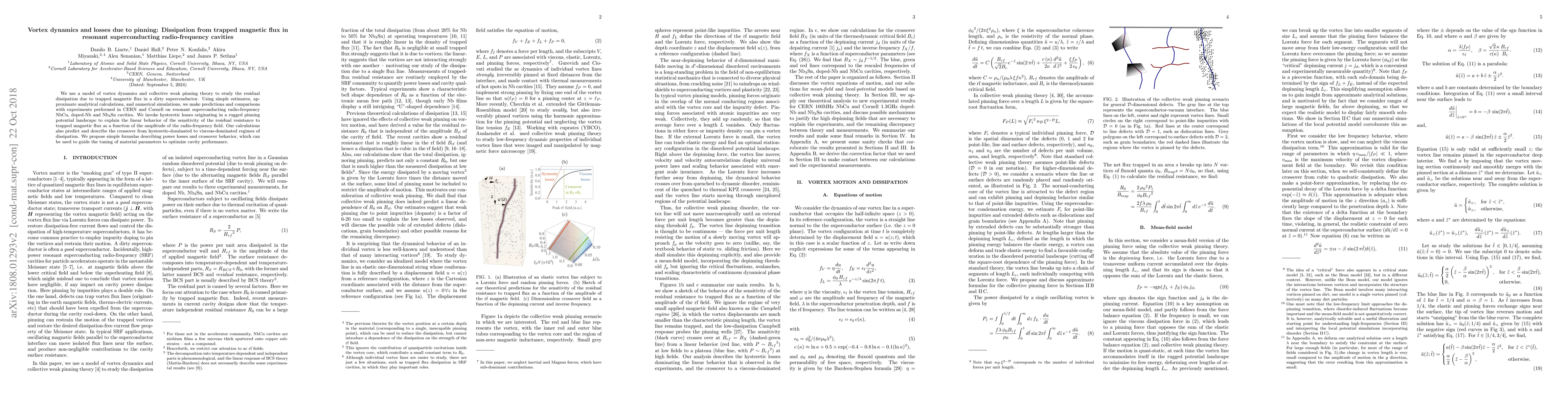 This paper models vortex dynamics and collective weak pinning to analyze residual dissipation in superconducting radio-frequency cavities due to trapped magnetic flux. It predicts hysteretic and viscous dissipation regimes and proposes formulas to optimize cavity performance based on material parameters.