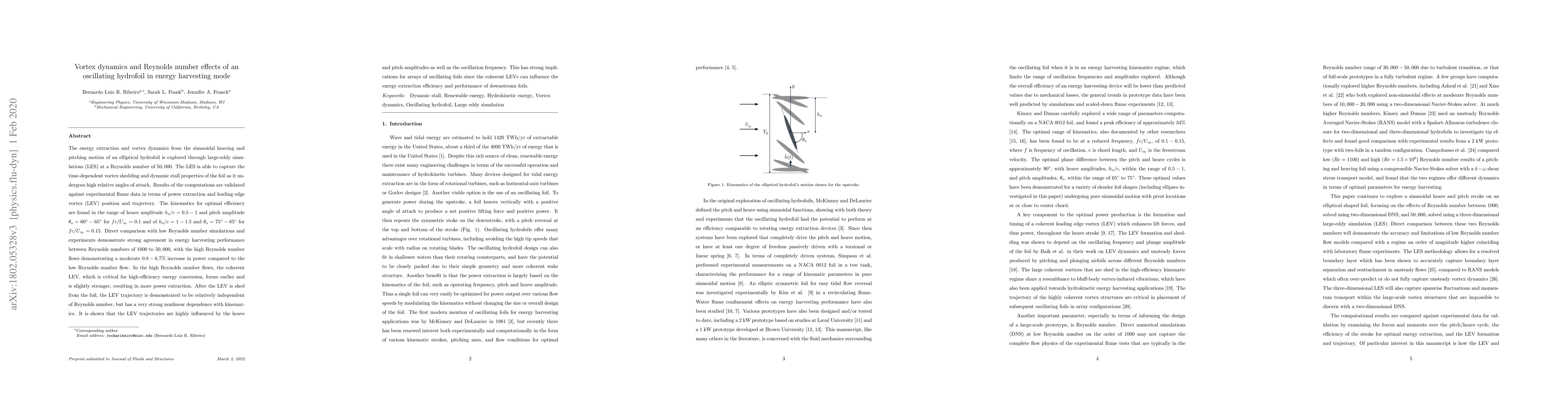 This paper investigates the energy extraction and vortex dynamics of an oscillating elliptical hydrofoil through large-eddy simulations at a Reynolds number of 50,000, finding optimal efficiency at specific heave and pitch amplitudes. High Reynolds number flows show a moderate increase in power extraction due to earlier and stronger leading edge vortices, which have complex nonlinear dependencies on foil kinematics.