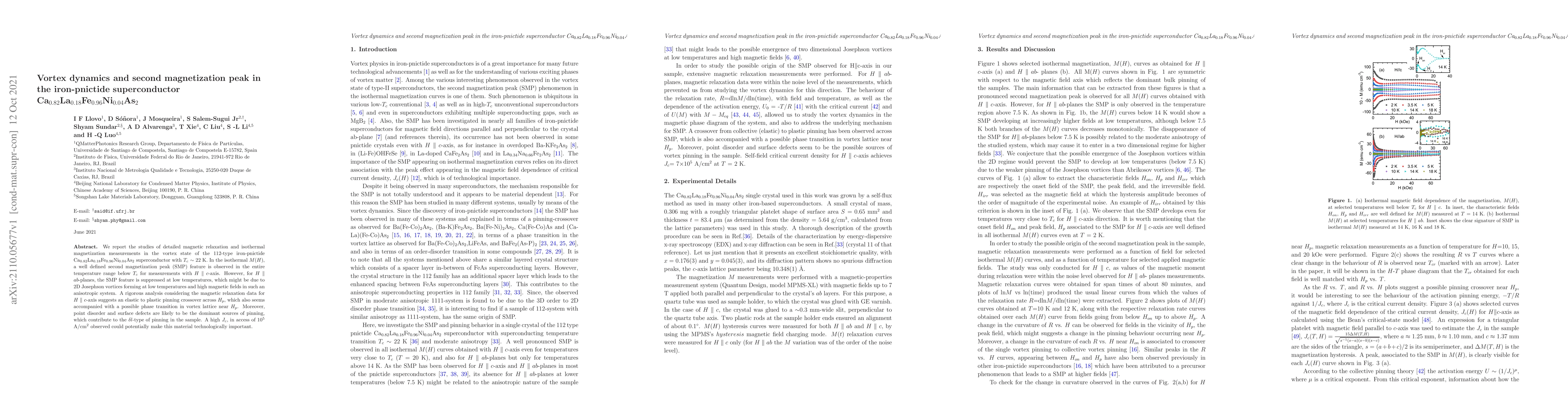 We report the studies of detailed magnetic relaxation and isothermal magnetization measurements in the vortex state of the 112-type iron-pnictide Ca$_{0.82}$La$_{0.18}$Fe$_{0.96}$Ni$_{0.04}$As$_2$ superconductor with $T_c$ $\sim$ 22 K. In the isothermal $M(H)$, a well defined second magnetization peak (SMP) feature is observed in the entire temperature range below $T_c$ for measurements with $H$ $\parallel$ $c$-axis. However, for $H$ $\parallel$ $ab$-planes, the SMP feature is suppressed at low temperatures, which might be due to 2D Josephson vortices forming at low temperatures and high magnetic fields in such an anisotropic system. A rigorous analysis considering the magnetic relaxation data for $H$ $\parallel$ $c$-axis suggests an elastic to plastic pinning crossover across $H_p$, which also seems accompanied with a possible phase transition in vortex lattice near $H_p$. Moreover, point disorder and surface defects are likely to be the dominant sources of pinning, which contribute to the $\delta l$-type of pinning in the sample. A high $J_c$, in access of 10$^5$ A/cm$^2$ observed could potentially make this material technologically important.
