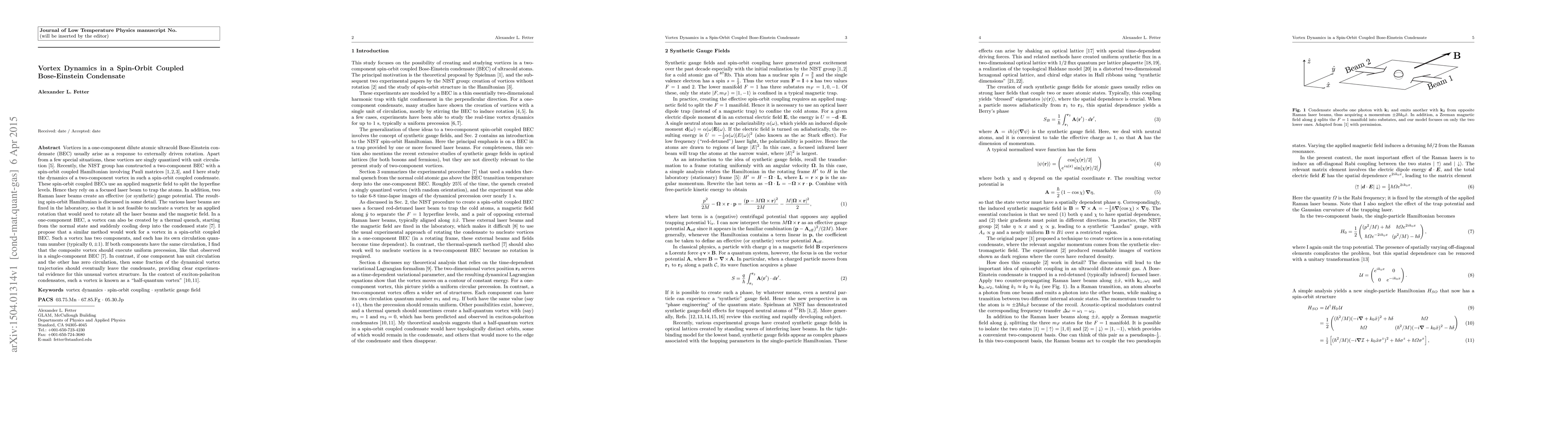 Vortices in a one-component dilute atomic ultracold Bose-Einstein condensate (BEC) usually arise as a response to externally driven rotation. Apart from a few special situations, these vortices are singly quantized with unit circulation. Recently, the NIST group has constructed a two-component BEC with a spin-orbit coupled Hamiltonian involving Pauli matrices, and I here study the dynamics of a two-component vortex in such a spin-orbit coupled condensate. These spin-orbit coupled BECs use an applied magnetic field to split the hyperfine levels. Hence they rely on a focused laser beam to trap the atoms. In addition, two Raman laser beams create an effective (or synthetic) gauge potential. The resulting spin-orbit Hamiltonian is discussed in some detail. The various laser beams are fixed in the laboratory, so that it is not feasible to nucleate a vortex by an applied rotation that would need to rotate all the laser beams and the magnetic field. In a one-component BEC, a vortex can also be created by a thermal quench, starting from the normal state and suddenly cooling deep into the condensed state. I propose that a similar method would work for a vortex in a spin-orbit coupled BEC. Such a vortex has two components, and each has its own circulation quantum number. If both components have the same circulation, I find that the composite vortex should execute uniform precession, like that observed in a single-component BEC. In contrast, if one component has unit circulation and the other has zero circulation, then some fraction of the dynamical vortex trajectories should eventually leave the condensate, providing clear experimental evidence for this unusual vortex structure. In the context of exciton-polariton condensates, such a vortex is known as a "half-quantum vortex".