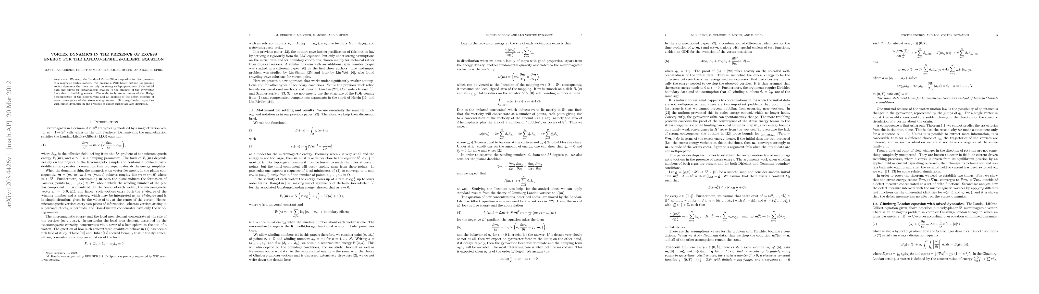 We study the Landau-Lifshitz-Gilbert equation for the dynamics of a magnetic vortex system. We present a PDE-based method for proving vortex dynamics that does not rely on strong well-preparedness of the initial data and allows for instantaneous changes in the strength of the gyrovector force due to bubbling events. The main tools are estimates of the Hodge decomposition of the supercurrent and an analysis of the defect measure of weak convergence of the stress energy tensor. Ginzburg-Landau equations with mixed dynamics in the presence of excess energy are also discussed.